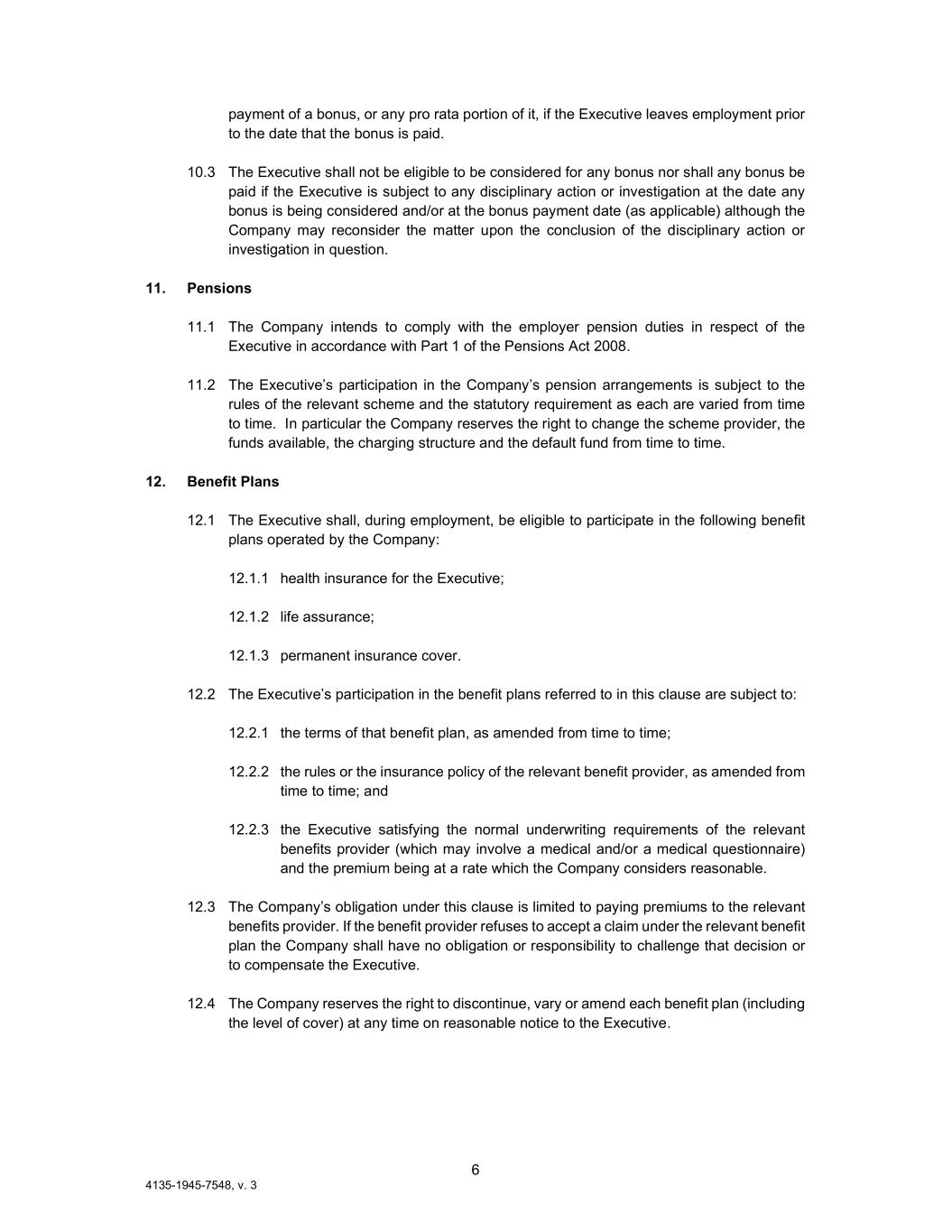 6 4135-1945-7548, v. 3 payment of a bonus, or any pro rata portion of it, if the Executive leaves employment prior to the date that the bonus is paid. 10.3 The Executive shall not be eligible to be considered for any bonus nor shall any bonus be paid if the Executive is subject to any disciplinary action or investigation at the date any bonus is being considered and/or at the bonus payment date (as applicable) although the Company may reconsider the matter upon the conclusion of the disciplinary action or investigation in question. 11. Pensions 11.1 The Company intends to comply with the employer pension duties in respect of the Executive in accordance with Part 1 of the Pensions Act 2008. 11.2 The Executive’s participation in the Company’s pension arrangements is subject to the rules of the relevant scheme and the statutory requirement as each are varied from time to time. In particular the Company reserves the right to change the scheme provider, the funds available, the charging structure and the default fund from time to time. 12. Benefit Plans 12.1 The Executive shall, during employment, be eligible to participate in the following benefit plans operated by the Company: 12.1.1 health insurance for the Executive; 12.1.2 life assurance; 12.1.3 permanent insurance cover. 12.2 The Executive’s participation in the benefit plans referred to in this clause are subject to: 12.2.1 the terms of that benefit plan, as amended from time to time; 12.2.2 the rules or the insurance policy of the relevant benefit provider, as amended from time to time; and 12.2.3 the Executive satisfying the normal underwriting requirements of the relevant benefits provider (which may involve a medical and/or a medical questionnaire) and the premium being at a rate which the Company considers reasonable. 12.3 The Company’s obligation under this clause is limited to paying premiums to the relevant benefits provider. If the benefit provider refuses to accept a claim under the relevant benefit plan the Company shall have no obligation or responsibility to challenge that decision or to compensate the Executive. 12.4 The Company reserves the right to discontinue, vary or amend each benefit plan (including the level of cover) at any time on reasonable notice to the Executive.