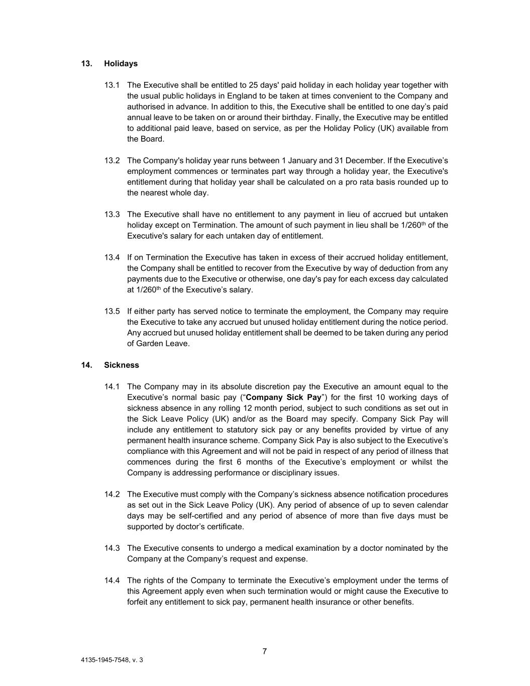 7 4135-1945-7548, v. 3 13. Holidays 13.1 The Executive shall be entitled to 25 days' paid holiday in each holiday year together with the usual public holidays in England to be taken at times convenient to the Company and authorised in advance. In addition to this, the Executive shall be entitled to one day’s paid annual leave to be taken on or around their birthday. Finally, the Executive may be entitled to additional paid leave, based on service, as per the Holiday Policy (UK) available from the Board. 13.2 The Company's holiday year runs between 1 January and 31 December. If the Executive’s employment commences or terminates part way through a holiday year, the Executive's entitlement during that holiday year shall be calculated on a pro rata basis rounded up to the nearest whole day. 13.3 The Executive shall have no entitlement to any payment in lieu of accrued but untaken holiday except on Termination. The amount of such payment in lieu shall be 1/260th of the Executive's salary for each untaken day of entitlement. 13.4 If on Termination the Executive has taken in excess of their accrued holiday entitlement, the Company shall be entitled to recover from the Executive by way of deduction from any payments due to the Executive or otherwise, one day's pay for each excess day calculated at 1/260th of the Executive’s salary. 13.5 If either party has served notice to terminate the employment, the Company may require the Executive to take any accrued but unused holiday entitlement during the notice period. Any accrued but unused holiday entitlement shall be deemed to be taken during any period of Garden Leave. 14. Sickness 14.1 The Company may in its absolute discretion pay the Executive an amount equal to the Executive’s normal basic pay (“Company Sick Pay”) for the first 10 working days of sickness absence in any rolling 12 month period, subject to such conditions as set out in the Sick Leave Policy (UK) and/or as the Board may specify. Company Sick Pay will include any entitlement to statutory sick pay or any benefits provided by virtue of any permanent health insurance scheme. Company Sick Pay is also subject to the Executive’s compliance with this Agreement and will not be paid in respect of any period of illness that commences during the first 6 months of the Executive’s employment or whilst the Company is addressing performance or disciplinary issues. 14.2 The Executive must comply with the Company’s sickness absence notification procedures as set out in the Sick Leave Policy (UK). Any period of absence of up to seven calendar days may be self-certified and any period of absence of more than five days must be supported by doctor’s certificate. 14.3 The Executive consents to undergo a medical examination by a doctor nominated by the Company at the Company’s request and expense. 14.4 The rights of the Company to terminate the Executive’s employment under the terms of this Agreement apply even when such termination would or might cause the Executive to forfeit any entitlement to sick pay, permanent health insurance or other benefits.