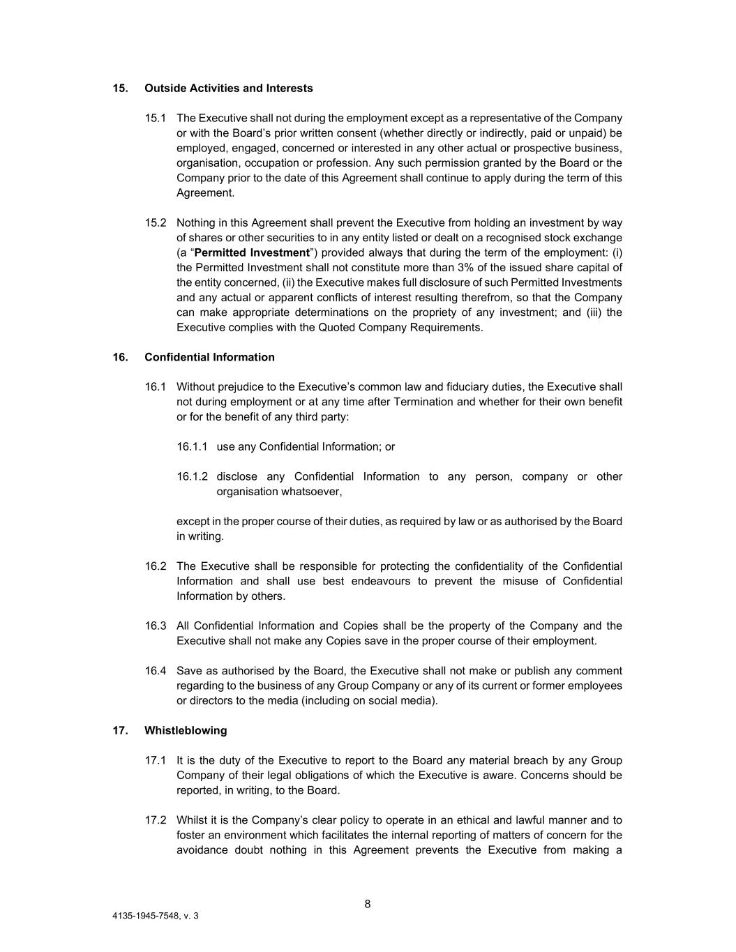 8 4135-1945-7548, v. 3 15. Outside Activities and Interests 15.1 The Executive shall not during the employment except as a representative of the Company or with the Board’s prior written consent (whether directly or indirectly, paid or unpaid) be employed, engaged, concerned or interested in any other actual or prospective business, organisation, occupation or profession. Any such permission granted by the Board or the Company prior to the date of this Agreement shall continue to apply during the term of this Agreement. 15.2 Nothing in this Agreement shall prevent the Executive from holding an investment by way of shares or other securities to in any entity listed or dealt on a recognised stock exchange (a “Permitted Investment”) provided always that during the term of the employment: (i) the Permitted Investment shall not constitute more than 3% of the issued share capital of the entity concerned, (ii) the Executive makes full disclosure of such Permitted Investments and any actual or apparent conflicts of interest resulting therefrom, so that the Company can make appropriate determinations on the propriety of any investment; and (iii) the Executive complies with the Quoted Company Requirements. 16. Confidential Information 16.1 Without prejudice to the Executive’s common law and fiduciary duties, the Executive shall not during employment or at any time after Termination and whether for their own benefit or for the benefit of any third party: 16.1.1 use any Confidential Information; or 16.1.2 disclose any Confidential Information to any person, company or other organisation whatsoever, except in the proper course of their duties, as required by law or as authorised by the Board in writing. 16.2 The Executive shall be responsible for protecting the confidentiality of the Confidential Information and shall use best endeavours to prevent the misuse of Confidential Information by others. 16.3 All Confidential Information and Copies shall be the property of the Company and the Executive shall not make any Copies save in the proper course of their employment. 16.4 Save as authorised by the Board, the Executive shall not make or publish any comment regarding to the business of any Group Company or any of its current or former employees or directors to the media (including on social media). 17. Whistleblowing 17.1 It is the duty of the Executive to report to the Board any material breach by any Group Company of their legal obligations of which the Executive is aware. Concerns should be reported, in writing, to the Board. 17.2 Whilst it is the Company’s clear policy to operate in an ethical and lawful manner and to foster an environment which facilitates the internal reporting of matters of concern for the avoidance doubt nothing in this Agreement prevents the Executive from making a