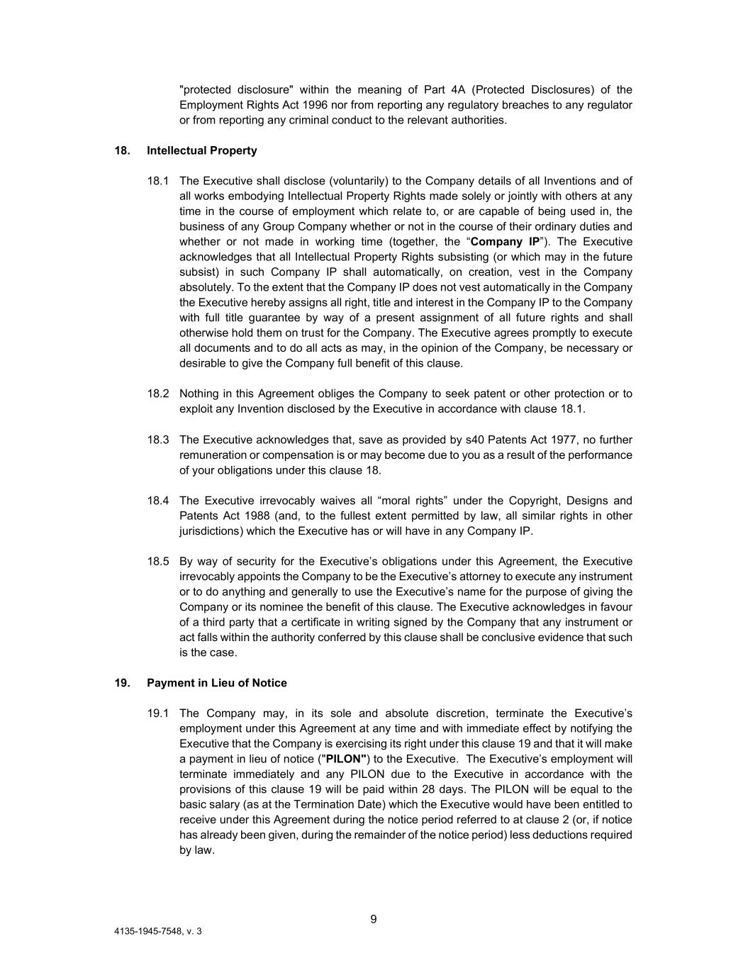 9 4135-1945-7548, v. 3 "protected disclosure" within the meaning of Part 4A (Protected Disclosures) of the Employment Rights Act 1996 nor from reporting any regulatory breaches to any regulator or from reporting any criminal conduct to the relevant authorities. 18. Intellectual Property 18.1 The Executive shall disclose (voluntarily) to the Company details of all Inventions and of all works embodying Intellectual Property Rights made solely or jointly with others at any time in the course of employment which relate to, or are capable of being used in, the business of any Group Company whether or not in the course of their ordinary duties and whether or not made in working time (together, the “Company IP”). The Executive acknowledges that all Intellectual Property Rights subsisting (or which may in the future subsist) in such Company IP shall automatically, on creation, vest in the Company absolutely. To the extent that the Company IP does not vest automatically in the Company the Executive hereby assigns all right, title and interest in the Company IP to the Company with full title guarantee by way of a present assignment of all future rights and shall otherwise hold them on trust for the Company. The Executive agrees promptly to execute all documents and to do all acts as may, in the opinion of the Company, be necessary or desirable to give the Company full benefit of this clause. 18.2 Nothing in this Agreement obliges the Company to seek patent or other protection or to exploit any Invention disclosed by the Executive in accordance with clause 18.1. 18.3 The Executive acknowledges that, save as provided by s40 Patents Act 1977, no further remuneration or compensation is or may become due to you as a result of the performance of your obligations under this clause 18. 18.4 The Executive irrevocably waives all “moral rights” under the Copyright, Designs and Patents Act 1988 (and, to the fullest extent permitted by law, all similar rights in other jurisdictions) which the Executive has or will have in any Company IP. 18.5 By way of security for the Executive’s obligations under this Agreement, the Executive irrevocably appoints the Company to be the Executive’s attorney to execute any instrument or to do anything and generally to use the Executive’s name for the purpose of giving the Company or its nominee the benefit of this clause. The Executive acknowledges in favour of a third party that a certificate in writing signed by the Company that any instrument or act falls within the authority conferred by this clause shall be conclusive evidence that such is the case. 19. Payment in Lieu of Notice 19.1 The Company may, in its sole and absolute discretion, terminate the Executive’s employment under this Agreement at any time and with immediate effect by notifying the Executive that the Company is exercising its right under this clause 19 and that it will make a payment in lieu of notice ("PILON") to the Executive. The Executive’s employment will terminate immediately and any PILON due to the Executive in accordance with the provisions of this clause 19 will be paid within 28 days. The PILON will be equal to the basic salary (as at the Termination Date) which the Executive would have been entitled to receive under this Agreement during the notice period referred to at clause 2 (or, if notice has already been given, during the remainder of the notice period) less deductions required by law.