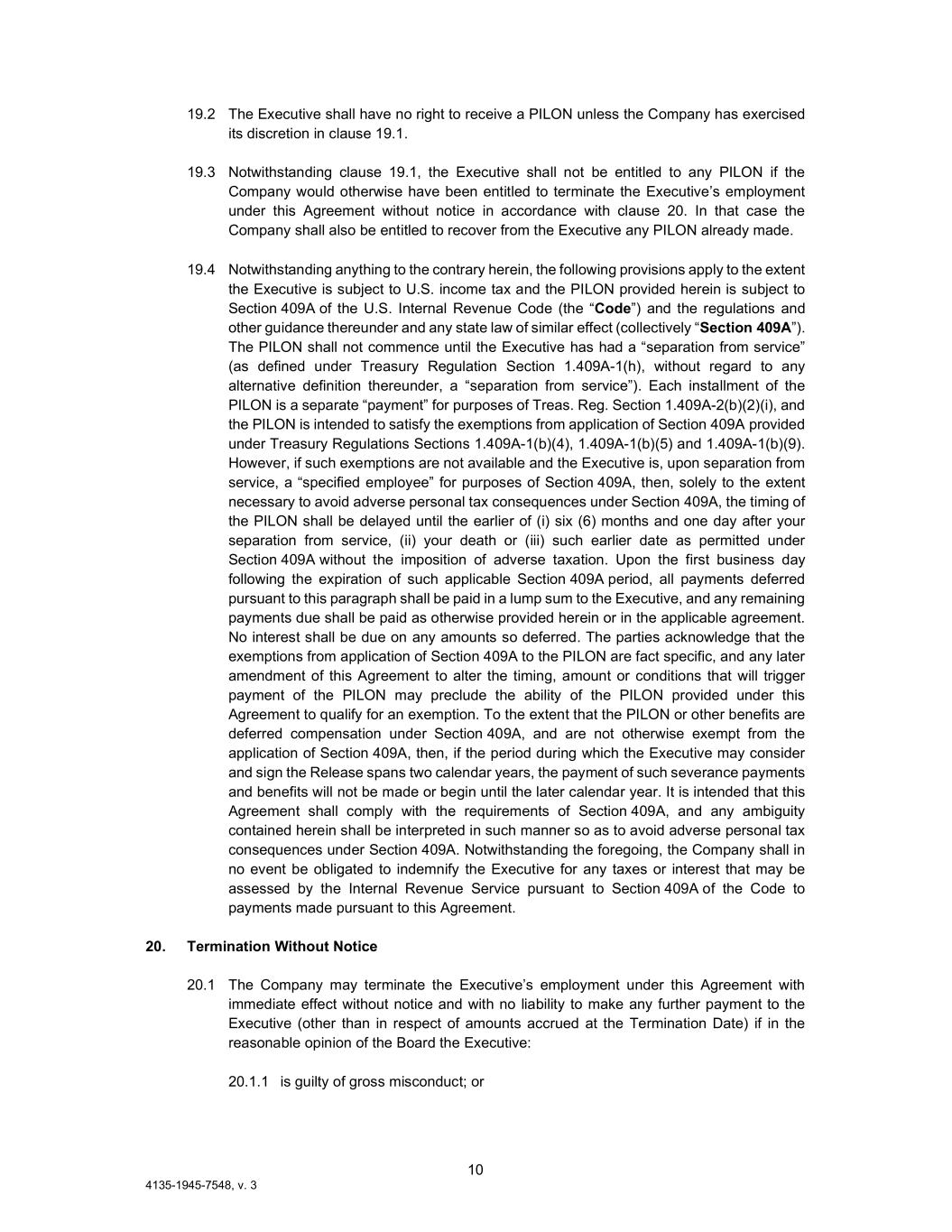 10 4135-1945-7548, v. 3 19.2 The Executive shall have no right to receive a PILON unless the Company has exercised its discretion in clause 19.1. 19.3 Notwithstanding clause 19.1, the Executive shall not be entitled to any PILON if the Company would otherwise have been entitled to terminate the Executive’s employment under this Agreement without notice in accordance with clause 20. In that case the Company shall also be entitled to recover from the Executive any PILON already made. 19.4 Notwithstanding anything to the contrary herein, the following provisions apply to the extent the Executive is subject to U.S. income tax and the PILON provided herein is subject to Section 409A of the U.S. Internal Revenue Code (the “Code”) and the regulations and other guidance thereunder and any state law of similar effect (collectively “Section 409A”). The PILON shall not commence until the Executive has had a “separation from service” (as defined under Treasury Regulation Section 1.409A-1(h), without regard to any alternative definition thereunder, a “separation from service”). Each installment of the PILON is a separate “payment” for purposes of Treas. Reg. Section 1.409A-2(b)(2)(i), and the PILON is intended to satisfy the exemptions from application of Section 409A provided under Treasury Regulations Sections 1.409A-1(b)(4), 1.409A-1(b)(5) and 1.409A-1(b)(9). However, if such exemptions are not available and the Executive is, upon separation from service, a “specified employee” for purposes of Section 409A, then, solely to the extent necessary to avoid adverse personal tax consequences under Section 409A, the timing of the PILON shall be delayed until the earlier of (i) six (6) months and one day after your separation from service, (ii) your death or (iii) such earlier date as permitted under Section 409A without the imposition of adverse taxation. Upon the first business day following the expiration of such applicable Section 409A period, all payments deferred pursuant to this paragraph shall be paid in a lump sum to the Executive, and any remaining payments due shall be paid as otherwise provided herein or in the applicable agreement. No interest shall be due on any amounts so deferred. The parties acknowledge that the exemptions from application of Section 409A to the PILON are fact specific, and any later amendment of this Agreement to alter the timing, amount or conditions that will trigger payment of the PILON may preclude the ability of the PILON provided under this Agreement to qualify for an exemption. To the extent that the PILON or other benefits are deferred compensation under Section 409A, and are not otherwise exempt from the application of Section 409A, then, if the period during which the Executive may consider and sign the Release spans two calendar years, the payment of such severance payments and benefits will not be made or begin until the later calendar year. It is intended that this Agreement shall comply with the requirements of Section 409A, and any ambiguity contained herein shall be interpreted in such manner so as to avoid adverse personal tax consequences under Section 409A. Notwithstanding the foregoing, the Company shall in no event be obligated to indemnify the Executive for any taxes or interest that may be assessed by the Internal Revenue Service pursuant to Section 409A of the Code to payments made pursuant to this Agreement. 20. Termination Without Notice 20.1 The Company may terminate the Executive’s employment under this Agreement with immediate effect without notice and with no liability to make any further payment to the Executive (other than in respect of amounts accrued at the Termination Date) if in the reasonable opinion of the Board the Executive: 20.1.1 is guilty of gross misconduct; or