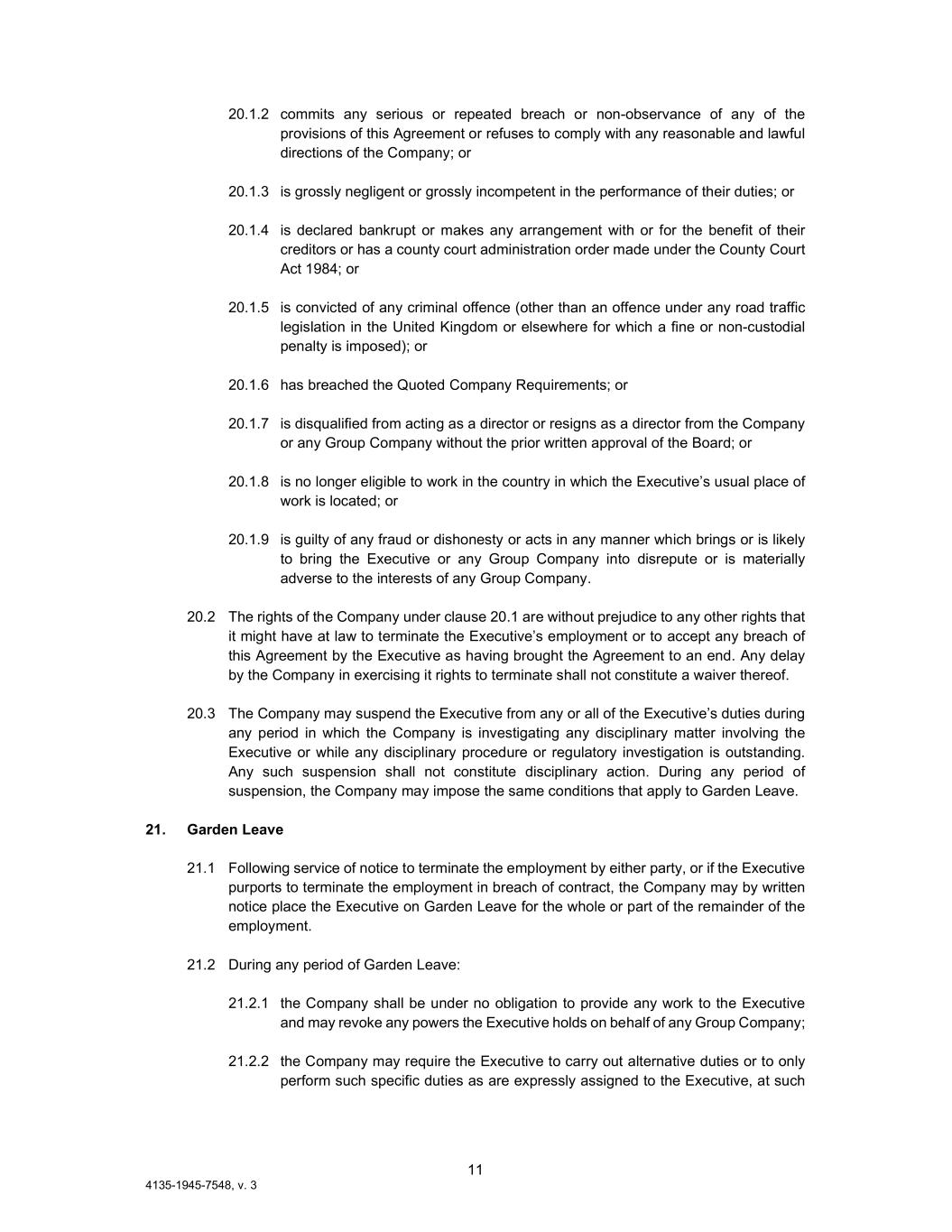 11 4135-1945-7548, v. 3 20.1.2 commits any serious or repeated breach or non-observance of any of the provisions of this Agreement or refuses to comply with any reasonable and lawful directions of the Company; or 20.1.3 is grossly negligent or grossly incompetent in the performance of their duties; or 20.1.4 is declared bankrupt or makes any arrangement with or for the benefit of their creditors or has a county court administration order made under the County Court Act 1984; or 20.1.5 is convicted of any criminal offence (other than an offence under any road traffic legislation in the United Kingdom or elsewhere for which a fine or non-custodial penalty is imposed); or 20.1.6 has breached the Quoted Company Requirements; or 20.1.7 is disqualified from acting as a director or resigns as a director from the Company or any Group Company without the prior written approval of the Board; or 20.1.8 is no longer eligible to work in the country in which the Executive’s usual place of work is located; or 20.1.9 is guilty of any fraud or dishonesty or acts in any manner which brings or is likely to bring the Executive or any Group Company into disrepute or is materially adverse to the interests of any Group Company. 20.2 The rights of the Company under clause 20.1 are without prejudice to any other rights that it might have at law to terminate the Executive’s employment or to accept any breach of this Agreement by the Executive as having brought the Agreement to an end. Any delay by the Company in exercising it rights to terminate shall not constitute a waiver thereof. 20.3 The Company may suspend the Executive from any or all of the Executive’s duties during any period in which the Company is investigating any disciplinary matter involving the Executive or while any disciplinary procedure or regulatory investigation is outstanding. Any such suspension shall not constitute disciplinary action. During any period of suspension, the Company may impose the same conditions that apply to Garden Leave. 21. Garden Leave 21.1 Following service of notice to terminate the employment by either party, or if the Executive purports to terminate the employment in breach of contract, the Company may by written notice place the Executive on Garden Leave for the whole or part of the remainder of the employment. 21.2 During any period of Garden Leave: 21.2.1 the Company shall be under no obligation to provide any work to the Executive and may revoke any powers the Executive holds on behalf of any Group Company; 21.2.2 the Company may require the Executive to carry out alternative duties or to only perform such specific duties as are expressly assigned to the Executive, at such