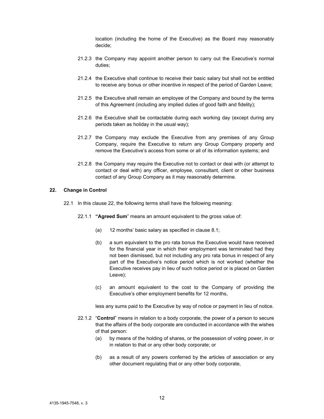 12 4135-1945-7548, v. 3 location (including the home of the Executive) as the Board may reasonably decide; 21.2.3 the Company may appoint another person to carry out the Executive’s normal duties; 21.2.4 the Executive shall continue to receive their basic salary but shall not be entitled to receive any bonus or other incentive in respect of the period of Garden Leave; 21.2.5 the Executive shall remain an employee of the Company and bound by the terms of this Agreement (including any implied duties of good faith and fidelity); 21.2.6 the Executive shall be contactable during each working day (except during any periods taken as holiday in the usual way); 21.2.7 the Company may exclude the Executive from any premises of any Group Company, require the Executive to return any Group Company property and remove the Executive’s access from some or all of its information systems; and 21.2.8 the Company may require the Executive not to contact or deal with (or attempt to contact or deal with) any officer, employee, consultant, client or other business contact of any Group Company as it may reasonably determine. 22. Change in Control 22.1 In this clause 22, the following terms shall have the following meaning: 22.1.1 “Agreed Sum” means an amount equivalent to the gross value of: (a) 12 months’ basic salary as specified in clause 8.1; (b) a sum equivalent to the pro rata bonus the Executive would have received for the financial year in which their employment was terminated had they not been dismissed, but not including any pro rata bonus in respect of any part of the Executive’s notice period which is not worked (whether the Executive receives pay in lieu of such notice period or is placed on Garden Leave); (c) an amount equivalent to the cost to the Company of providing the Executive’s other employment benefits for 12 months, less any sums paid to the Executive by way of notice or payment in lieu of notice. 22.1.2 “Control” means in relation to a body corporate, the power of a person to secure that the affairs of the body corporate are conducted in accordance with the wishes of that person: (a) by means of the holding of shares, or the possession of voting power, in or in relation to that or any other body corporate; or (b) as a result of any powers conferred by the articles of association or any other document regulating that or any other body corporate,