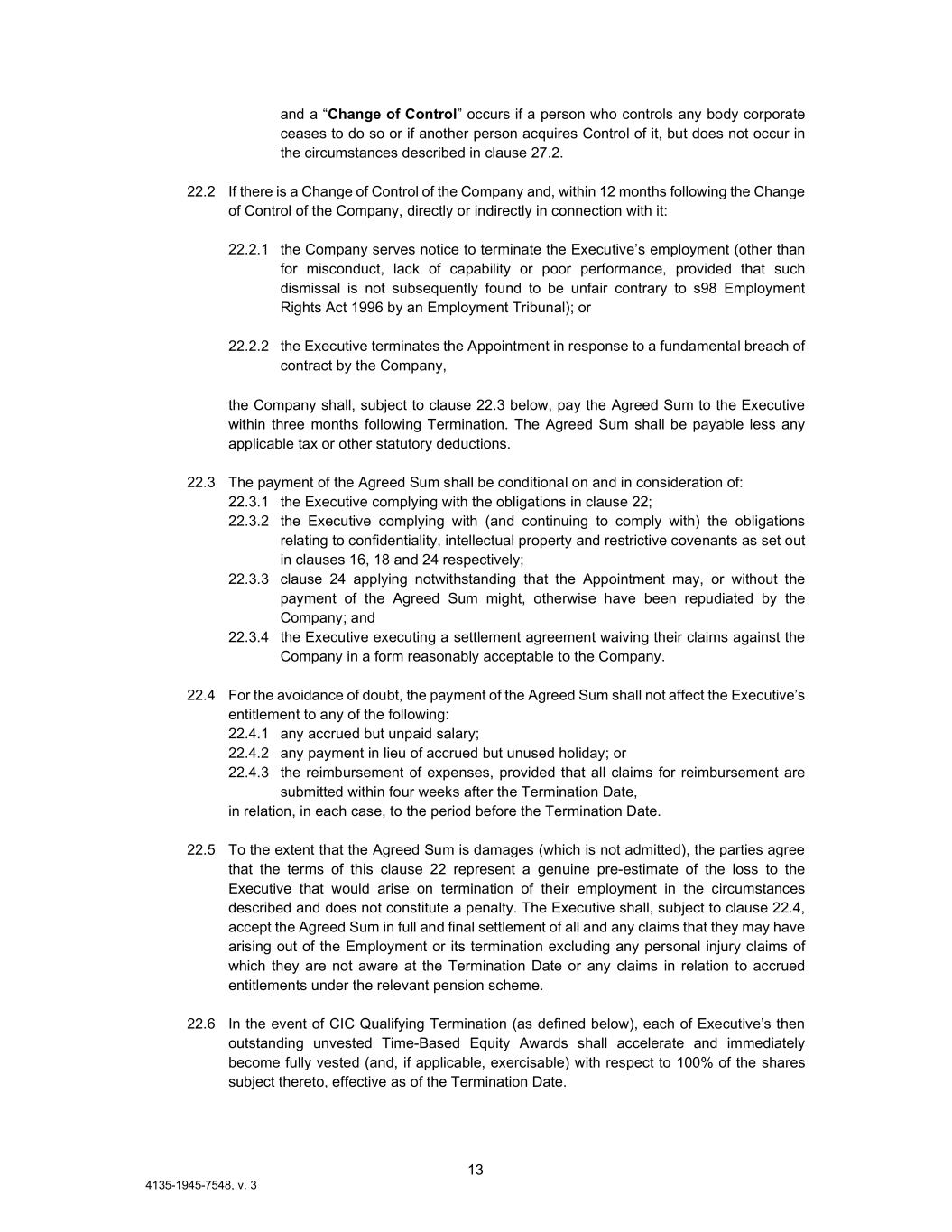 13 4135-1945-7548, v. 3 and a “Change of Control” occurs if a person who controls any body corporate ceases to do so or if another person acquires Control of it, but does not occur in the circumstances described in clause 27.2. 22.2 If there is a Change of Control of the Company and, within 12 months following the Change of Control of the Company, directly or indirectly in connection with it: 22.2.1 the Company serves notice to terminate the Executive’s employment (other than for misconduct, lack of capability or poor performance, provided that such dismissal is not subsequently found to be unfair contrary to s98 Employment Rights Act 1996 by an Employment Tribunal); or 22.2.2 the Executive terminates the Appointment in response to a fundamental breach of contract by the Company, the Company shall, subject to clause 22.3 below, pay the Agreed Sum to the Executive within three months following Termination. The Agreed Sum shall be payable less any applicable tax or other statutory deductions. 22.3 The payment of the Agreed Sum shall be conditional on and in consideration of: 22.3.1 the Executive complying with the obligations in clause 22; 22.3.2 the Executive complying with (and continuing to comply with) the obligations relating to confidentiality, intellectual property and restrictive covenants as set out in clauses 16, 18 and 24 respectively; 22.3.3 clause 24 applying notwithstanding that the Appointment may, or without the payment of the Agreed Sum might, otherwise have been repudiated by the Company; and 22.3.4 the Executive executing a settlement agreement waiving their claims against the Company in a form reasonably acceptable to the Company. 22.4 For the avoidance of doubt, the payment of the Agreed Sum shall not affect the Executive’s entitlement to any of the following: 22.4.1 any accrued but unpaid salary; 22.4.2 any payment in lieu of accrued but unused holiday; or 22.4.3 the reimbursement of expenses, provided that all claims for reimbursement are submitted within four weeks after the Termination Date, in relation, in each case, to the period before the Termination Date. 22.5 To the extent that the Agreed Sum is damages (which is not admitted), the parties agree that the terms of this clause 22 represent a genuine pre-estimate of the loss to the Executive that would arise on termination of their employment in the circumstances described and does not constitute a penalty. The Executive shall, subject to clause 22.4, accept the Agreed Sum in full and final settlement of all and any claims that they may have arising out of the Employment or its termination excluding any personal injury claims of which they are not aware at the Termination Date or any claims in relation to accrued entitlements under the relevant pension scheme. 22.6 In the event of CIC Qualifying Termination (as defined below), each of Executive’s then outstanding unvested Time-Based Equity Awards shall accelerate and immediately become fully vested (and, if applicable, exercisable) with respect to 100% of the shares subject thereto, effective as of the Termination Date.