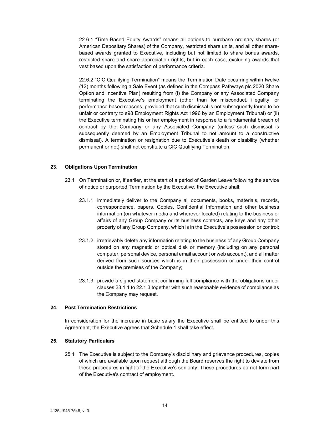 14 4135-1945-7548, v. 3 22.6.1 “Time-Based Equity Awards” means all options to purchase ordinary shares (or American Depositary Shares) of the Company, restricted share units, and all other share- based awards granted to Executive, including but not limited to share bonus awards, restricted share and share appreciation rights, but in each case, excluding awards that vest based upon the satisfaction of performance criteria. 22.6.2 “CIC Qualifying Termination” means the Termination Date occurring within twelve (12) months following a Sale Event (as defined in the Compass Pathways plc 2020 Share Option and Incentive Plan) resulting from (i) the Company or any Associated Company terminating the Executive’s employment (other than for misconduct, illegality, or performance based reasons, provided that such dismissal is not subsequently found to be unfair or contrary to s98 Employment Rights Act 1996 by an Employment Tribunal) or (ii) the Executive terminating his or her employment in response to a fundamental breach of contract by the Company or any Associated Company (unless such dismissal is subsequently deemed by an Employment Tribunal to not amount to a constructive dismissal). A termination or resignation due to Executive’s death or disability (whether permanent or not) shall not constitute a CIC Qualifying Termination. 23. Obligations Upon Termination 23.1 On Termination or, if earlier, at the start of a period of Garden Leave following the service of notice or purported Termination by the Executive, the Executive shall: 23.1.1 immediately deliver to the Company all documents, books, materials, records, correspondence, papers, Copies, Confidential Information and other business information (on whatever media and wherever located) relating to the business or affairs of any Group Company or its business contacts, any keys and any other property of any Group Company, which is in the Executive’s possession or control; 23.1.2 irretrievably delete any information relating to the business of any Group Company stored on any magnetic or optical disk or memory (including on any personal computer, personal device, personal email account or web account), and all matter derived from such sources which is in their possession or under their control outside the premises of the Company; 23.1.3 provide a signed statement confirming full compliance with the obligations under clauses 23.1.1 to 22.1.3 together with such reasonable evidence of compliance as the Company may request. 24. Post Termination Restrictions In consideration for the increase in basic salary the Executive shall be entitled to under this Agreement, the Executive agrees that Schedule 1 shall take effect. 25. Statutory Particulars 25.1 The Executive is subject to the Company's disciplinary and grievance procedures, copies of which are available upon request although the Board reserves the right to deviate from these procedures in light of the Executive’s seniority. These procedures do not form part of the Executive's contract of employment.