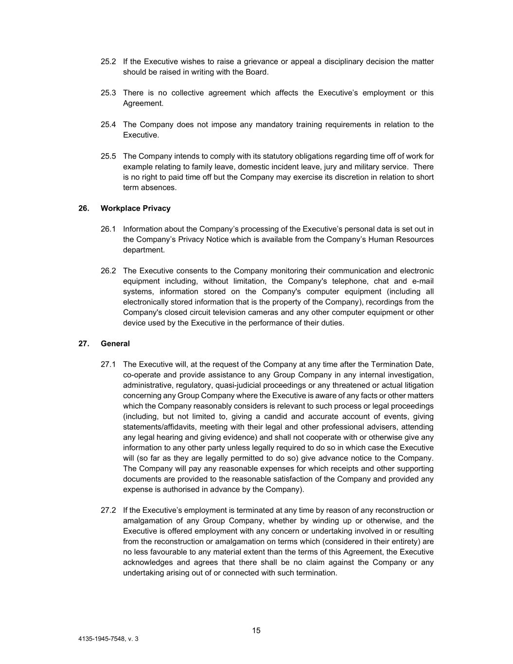 15 4135-1945-7548, v. 3 25.2 If the Executive wishes to raise a grievance or appeal a disciplinary decision the matter should be raised in writing with the Board. 25.3 There is no collective agreement which affects the Executive’s employment or this Agreement. 25.4 The Company does not impose any mandatory training requirements in relation to the Executive. 25.5 The Company intends to comply with its statutory obligations regarding time off of work for example relating to family leave, domestic incident leave, jury and military service. There is no right to paid time off but the Company may exercise its discretion in relation to short term absences. 26. Workplace Privacy 26.1 Information about the Company’s processing of the Executive’s personal data is set out in the Company’s Privacy Notice which is available from the Company’s Human Resources department. 26.2 The Executive consents to the Company monitoring their communication and electronic equipment including, without limitation, the Company's telephone, chat and e-mail systems, information stored on the Company's computer equipment (including all electronically stored information that is the property of the Company), recordings from the Company's closed circuit television cameras and any other computer equipment or other device used by the Executive in the performance of their duties. 27. General 27.1 The Executive will, at the request of the Company at any time after the Termination Date, co-operate and provide assistance to any Group Company in any internal investigation, administrative, regulatory, quasi-judicial proceedings or any threatened or actual litigation concerning any Group Company where the Executive is aware of any facts or other matters which the Company reasonably considers is relevant to such process or legal proceedings (including, but not limited to, giving a candid and accurate account of events, giving statements/affidavits, meeting with their legal and other professional advisers, attending any legal hearing and giving evidence) and shall not cooperate with or otherwise give any information to any other party unless legally required to do so in which case the Executive will (so far as they are legally permitted to do so) give advance notice to the Company. The Company will pay any reasonable expenses for which receipts and other supporting documents are provided to the reasonable satisfaction of the Company and provided any expense is authorised in advance by the Company). 27.2 If the Executive’s employment is terminated at any time by reason of any reconstruction or amalgamation of any Group Company, whether by winding up or otherwise, and the Executive is offered employment with any concern or undertaking involved in or resulting from the reconstruction or amalgamation on terms which (considered in their entirety) are no less favourable to any material extent than the terms of this Agreement, the Executive acknowledges and agrees that there shall be no claim against the Company or any undertaking arising out of or connected with such termination.
