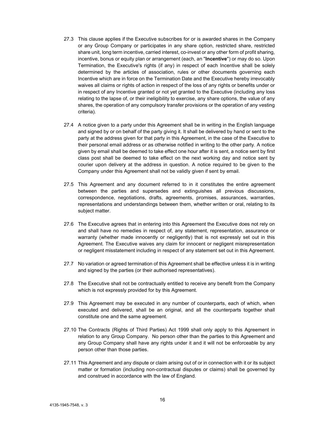 16 4135-1945-7548, v. 3 27.3 This clause applies if the Executive subscribes for or is awarded shares in the Company or any Group Company or participates in any share option, restricted share, restricted share unit, long term incentive, carried interest, co-invest or any other form of profit sharing, incentive, bonus or equity plan or arrangement (each, an "Incentive") or may do so. Upon Termination, the Executive's rights (if any) in respect of each Incentive shall be solely determined by the articles of association, rules or other documents governing each Incentive which are in force on the Termination Date and the Executive hereby irrevocably waives all claims or rights of action in respect of the loss of any rights or benefits under or in respect of any Incentive granted or not yet granted to the Executive (including any loss relating to the lapse of, or their ineligibility to exercise, any share options, the value of any shares, the operation of any compulsory transfer provisions or the operation of any vesting criteria). 27.4 A notice given to a party under this Agreement shall be in writing in the English language and signed by or on behalf of the party giving it. It shall be delivered by hand or sent to the party at the address given for that party in this Agreement, in the case of the Executive to their personal email address or as otherwise notified in writing to the other party. A notice given by email shall be deemed to take effect one hour after it is sent, a notice sent by first class post shall be deemed to take effect on the next working day and notice sent by courier upon delivery at the address in question. A notice required to be given to the Company under this Agreement shall not be validly given if sent by email. 27.5 This Agreement and any document referred to in it constitutes the entire agreement between the parties and supersedes and extinguishes all previous discussions, correspondence, negotiations, drafts, agreements, promises, assurances, warranties, representations and understandings between them, whether written or oral, relating to its subject matter. 27.6 The Executive agrees that in entering into this Agreement the Executive does not rely on and shall have no remedies in respect of, any statement, representation, assurance or warranty (whether made innocently or negligently) that is not expressly set out in this Agreement. The Executive waives any claim for innocent or negligent misrepresentation or negligent misstatement including in respect of any statement set out in this Agreement. 27.7 No variation or agreed termination of this Agreement shall be effective unless it is in writing and signed by the parties (or their authorised representatives). 27.8 The Executive shall not be contractually entitled to receive any benefit from the Company which is not expressly provided for by this Agreement. 27.9 This Agreement may be executed in any number of counterparts, each of which, when executed and delivered, shall be an original, and all the counterparts together shall constitute one and the same agreement. 27.10 The Contracts (Rights of Third Parties) Act 1999 shall only apply to this Agreement in relation to any Group Company. No person other than the parties to this Agreement and any Group Company shall have any rights under it and it will not be enforceable by any person other than those parties. 27.11 This Agreement and any dispute or claim arising out of or in connection with it or its subject matter or formation (including non-contractual disputes or claims) shall be governed by and construed in accordance with the law of England.