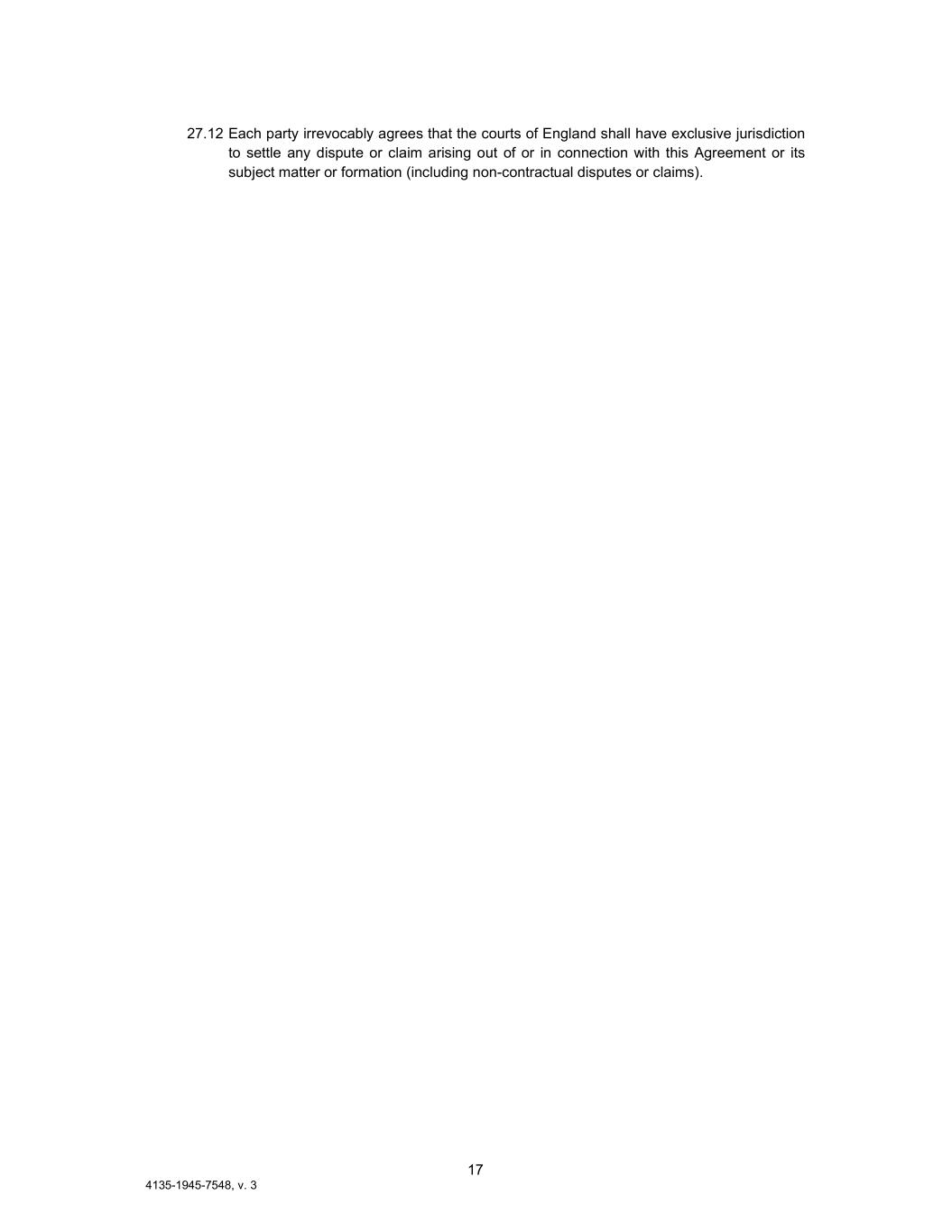 17 4135-1945-7548, v. 3 27.12 Each party irrevocably agrees that the courts of England shall have exclusive jurisdiction to settle any dispute or claim arising out of or in connection with this Agreement or its subject matter or formation (including non-contractual disputes or claims).
