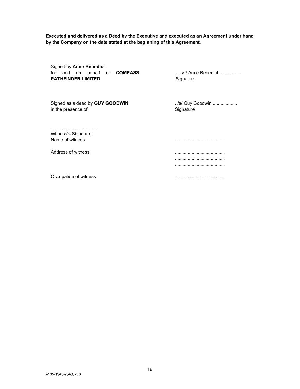 18 4135-1945-7548, v. 3 Executed and delivered as a Deed by the Executive and executed as an Agreement under hand by the Company on the date stated at the beginning of this Agreement. Signed by Anne Benedict for and on behalf of COMPASS PATHFINDER LIMITED ...../s/ Anne Benedict.................. Signature Signed as a deed by GUY GOODWIN in the presence of: ../s/ Guy Goodwin.................... Signature ..................................... Witness’s Signature Name of witness Address of witness Occupation of witness ....................................... ....................................... ....................................... ....................................... .......................................