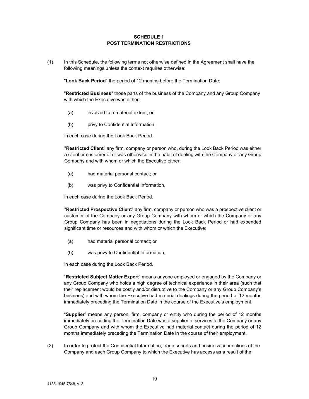 19 4135-1945-7548, v. 3 SCHEDULE 1 POST TERMINATION RESTRICTIONS (1) In this Schedule, the following terms not otherwise defined in the Agreement shall have the following meanings unless the context requires otherwise: "Look Back Period" the period of 12 months before the Termination Date; "Restricted Business" those parts of the business of the Company and any Group Company with which the Executive was either: (a) involved to a material extent; or (b) privy to Confidential Information, in each case during the Look Back Period. "Restricted Client" any firm, company or person who, during the Look Back Period was either a client or customer of or was otherwise in the habit of dealing with the Company or any Group Company and with whom or which the Executive either: (a) had material personal contact; or (b) was privy to Confidential Information, in each case during the Look Back Period. "Restricted Prospective Client" any firm, company or person who was a prospective client or customer of the Company or any Group Company with whom or which the Company or any Group Company has been in negotiations during the Look Back Period or had expended significant time or resources and with whom or which the Executive: (a) had material personal contact; or (b) was privy to Confidential Information, in each case during the Look Back Period. “Restricted Subject Matter Expert” means anyone employed or engaged by the Company or any Group Company who holds a high degree of technical experience in their area (such that their replacement would be costly and/or disruptive to the Company or any Group Company’s business) and with whom the Executive had material dealings during the period of 12 months immediately preceding the Termination Date in the course of the Executive’s employment. “Supplier” means any person, firm, company or entity who during the period of 12 months immediately preceding the Termination Date was a supplier of services to the Company or any Group Company and with whom the Executive had material contact during the period of 12 months immediately preceding the Termination Date in the course of their employment. (2) In order to protect the Confidential Information, trade secrets and business connections of the Company and each Group Company to which the Executive has access as a result of the