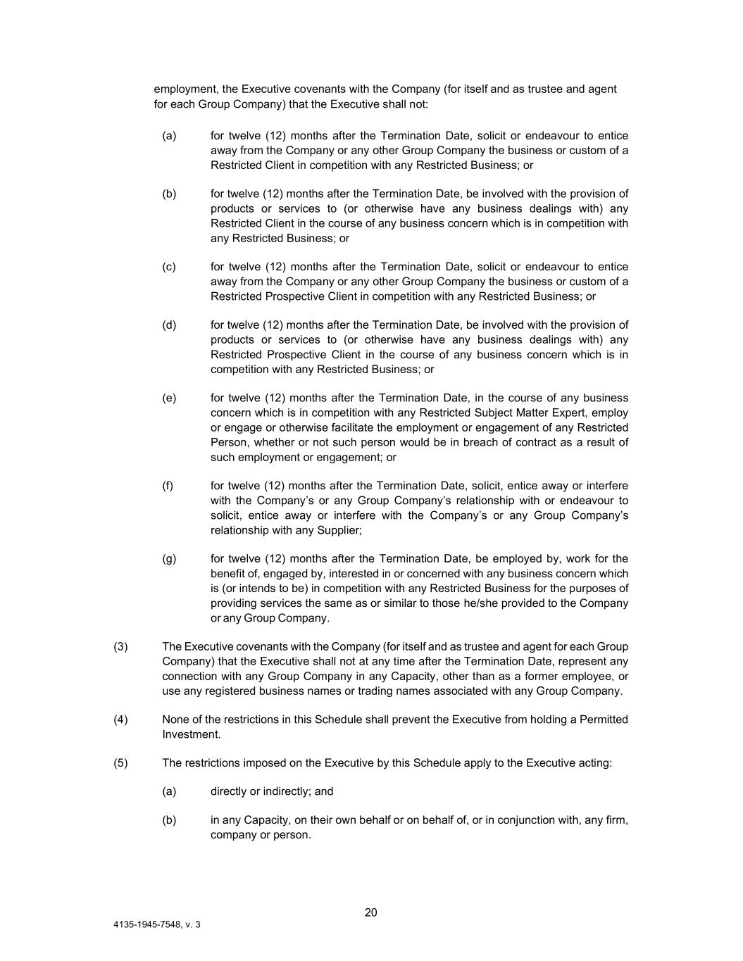 20 4135-1945-7548, v. 3 employment, the Executive covenants with the Company (for itself and as trustee and agent for each Group Company) that the Executive shall not: (a) for twelve (12) months after the Termination Date, solicit or endeavour to entice away from the Company or any other Group Company the business or custom of a Restricted Client in competition with any Restricted Business; or (b) for twelve (12) months after the Termination Date, be involved with the provision of products or services to (or otherwise have any business dealings with) any Restricted Client in the course of any business concern which is in competition with any Restricted Business; or (c) for twelve (12) months after the Termination Date, solicit or endeavour to entice away from the Company or any other Group Company the business or custom of a Restricted Prospective Client in competition with any Restricted Business; or (d) for twelve (12) months after the Termination Date, be involved with the provision of products or services to (or otherwise have any business dealings with) any Restricted Prospective Client in the course of any business concern which is in competition with any Restricted Business; or (e) for twelve (12) months after the Termination Date, in the course of any business concern which is in competition with any Restricted Subject Matter Expert, employ or engage or otherwise facilitate the employment or engagement of any Restricted Person, whether or not such person would be in breach of contract as a result of such employment or engagement; or (f) for twelve (12) months after the Termination Date, solicit, entice away or interfere with the Company’s or any Group Company’s relationship with or endeavour to solicit, entice away or interfere with the Company’s or any Group Company’s relationship with any Supplier; (g) for twelve (12) months after the Termination Date, be employed by, work for the benefit of, engaged by, interested in or concerned with any business concern which is (or intends to be) in competition with any Restricted Business for the purposes of providing services the same as or similar to those he/she provided to the Company or any Group Company. (3) The Executive covenants with the Company (for itself and as trustee and agent for each Group Company) that the Executive shall not at any time after the Termination Date, represent any connection with any Group Company in any Capacity, other than as a former employee, or use any registered business names or trading names associated with any Group Company. (4) None of the restrictions in this Schedule shall prevent the Executive from holding a Permitted Investment. (5) The restrictions imposed on the Executive by this Schedule apply to the Executive acting: (a) directly or indirectly; and (b) in any Capacity, on their own behalf or on behalf of, or in conjunction with, any firm, company or person.