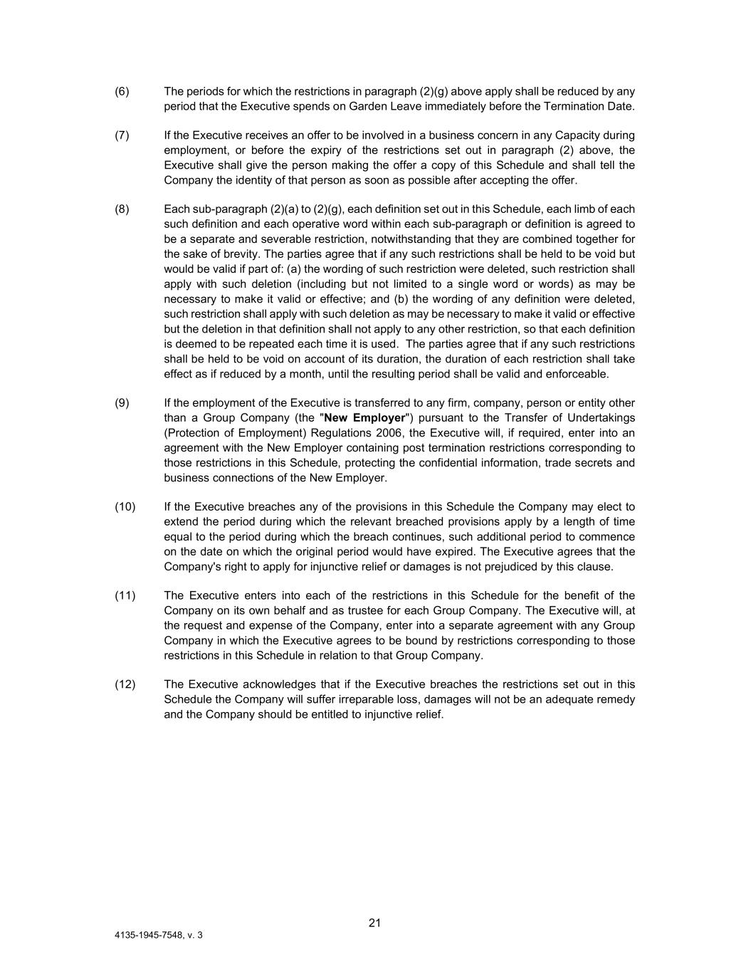 21 4135-1945-7548, v. 3 (6) The periods for which the restrictions in paragraph (2)(g) above apply shall be reduced by any period that the Executive spends on Garden Leave immediately before the Termination Date. (7) If the Executive receives an offer to be involved in a business concern in any Capacity during employment, or before the expiry of the restrictions set out in paragraph (2) above, the Executive shall give the person making the offer a copy of this Schedule and shall tell the Company the identity of that person as soon as possible after accepting the offer. (8) Each sub-paragraph (2)(a) to (2)(g), each definition set out in this Schedule, each limb of each such definition and each operative word within each sub-paragraph or definition is agreed to be a separate and severable restriction, notwithstanding that they are combined together for the sake of brevity. The parties agree that if any such restrictions shall be held to be void but would be valid if part of: (a) the wording of such restriction were deleted, such restriction shall apply with such deletion (including but not limited to a single word or words) as may be necessary to make it valid or effective; and (b) the wording of any definition were deleted, such restriction shall apply with such deletion as may be necessary to make it valid or effective but the deletion in that definition shall not apply to any other restriction, so that each definition is deemed to be repeated each time it is used. The parties agree that if any such restrictions shall be held to be void on account of its duration, the duration of each restriction shall take effect as if reduced by a month, until the resulting period shall be valid and enforceable. (9) If the employment of the Executive is transferred to any firm, company, person or entity other than a Group Company (the "New Employer") pursuant to the Transfer of Undertakings (Protection of Employment) Regulations 2006, the Executive will, if required, enter into an agreement with the New Employer containing post termination restrictions corresponding to those restrictions in this Schedule, protecting the confidential information, trade secrets and business connections of the New Employer. (10) If the Executive breaches any of the provisions in this Schedule the Company may elect to extend the period during which the relevant breached provisions apply by a length of time equal to the period during which the breach continues, such additional period to commence on the date on which the original period would have expired. The Executive agrees that the Company's right to apply for injunctive relief or damages is not prejudiced by this clause. (11) The Executive enters into each of the restrictions in this Schedule for the benefit of the Company on its own behalf and as trustee for each Group Company. The Executive will, at the request and expense of the Company, enter into a separate agreement with any Group Company in which the Executive agrees to be bound by restrictions corresponding to those restrictions in this Schedule in relation to that Group Company. (12) The Executive acknowledges that if the Executive breaches the restrictions set out in this Schedule the Company will suffer irreparable loss, damages will not be an adequate remedy and the Company should be entitled to injunctive relief.