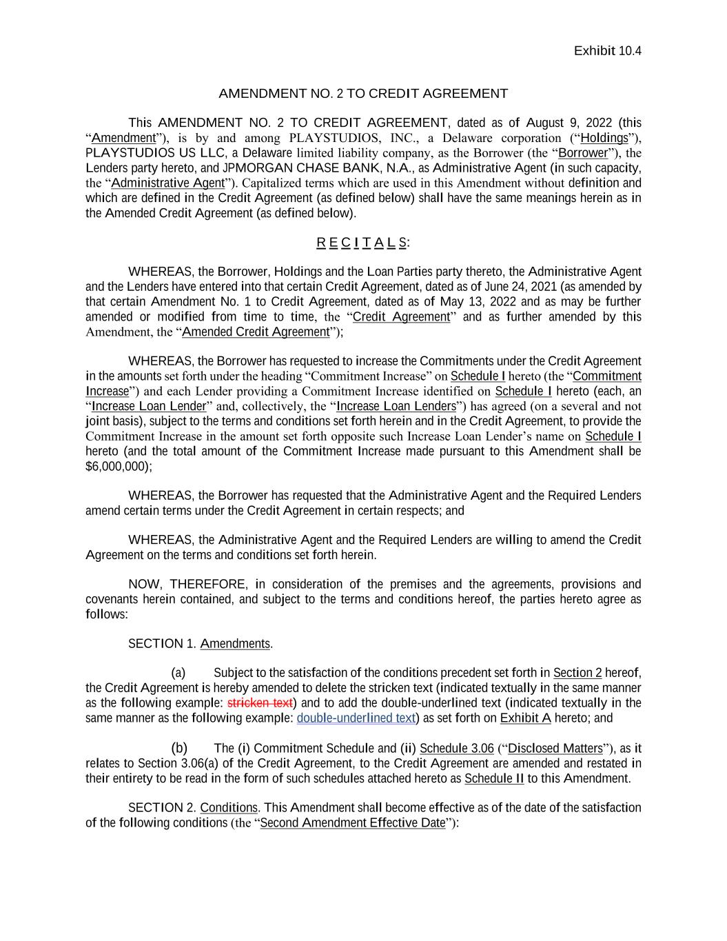 Exhibit 10.4 AMENDMENT NO. 2 TO CREDIT AGREEMENT This AMENDMENT NO. 2 TO CREDIT AGREEMENT, dated as of August 9, 2022 (this “Amendment”), is by and among PLAYSTUDIOS, INC., a Delaware corporation (“Holdings”), PLAYSTUDIOS US LLC, a Delaware limited liability company, as the Borrower (the “Borrower”), the Lenders party hereto, and JPMORGAN CHASE BANK, N.A., as Administrative Agent (in such capacity, the “Administrative Agent”). Capitalized terms which are used in this Amendment without definition and which are defined in the Credit Agreement (as defined below) shall have the same meanings herein as in the Amended Credit Agreement (as defined below). R E C I T A L S: WHEREAS, the Borrower, Holdings and the Loan Parties party thereto, the Administrative Agent and the Lenders have entered into that certain Credit Agreement, dated as of June 24, 2021 (as amended by that certain Amendment No. 1 to Credit Agreement, dated as of May 13, 2022 and as may be further amended or modified from time to time, the “Credit Agreement” and as further amended by this Amendment, the “Amended Credit Agreement”); WHEREAS, the Borrower has requested to increase the Commitments under the Credit Agreement in the amounts set forth under the heading “Commitment Increase” on Schedule I hereto (the “Commitment Increase”) and each Lender providing a Commitment Increase identified on Schedule I hereto (each, an “Increase Loan Lender” and, collectively, the “Increase Loan Lenders”) has agreed (on a several and not joint basis), subject to the terms and conditions set forth herein and in the Credit Agreement, to provide the Commitment Increase in the amount set forth opposite such Increase Loan Lender’s name on Schedule I hereto (and the total amount of the Commitment Increase made pursuant to this Amendment shall be $6,000,000); WHEREAS, the Borrower has requested that the Administrative Agent and the Required Lenders amend certain terms under the Credit Agreement in certain respects; and WHEREAS, the Administrative Agent and the Required Lenders are willing to amend the Credit Agreement on the terms and conditions set forth herein. NOW, THEREFORE, in consideration of the premises and the agreements, provisions and covenants herein contained, and subject to the terms and conditions hereof, the parties hereto agree as follows: SECTION 1. Amendments. (a) Subject to the satisfaction of the conditions precedent set forth in Section 2 hereof, the Credit Agreement is hereby amended to delete the stricken text (indicated textually in the same manner as the following example: stricken text) and to add the double-underlined text (indicated textually in the same manner as the following example: double-underlined text) as set forth on Exhibit A hereto; and (b) The (i) Commitment Schedule and (ii) Schedule 3.06 (“Disclosed Matters”), as it relates to Section 3.06(a) of the Credit Agreement, to the Credit Agreement are amended and restated in their entirety to be read in the form of such schedules attached hereto as Schedule II to this Amendment. SECTION 2. Conditions. This Amendment shall become effective as of the date of the satisfaction of the following conditions (the “Second Amendment Effective Date”):