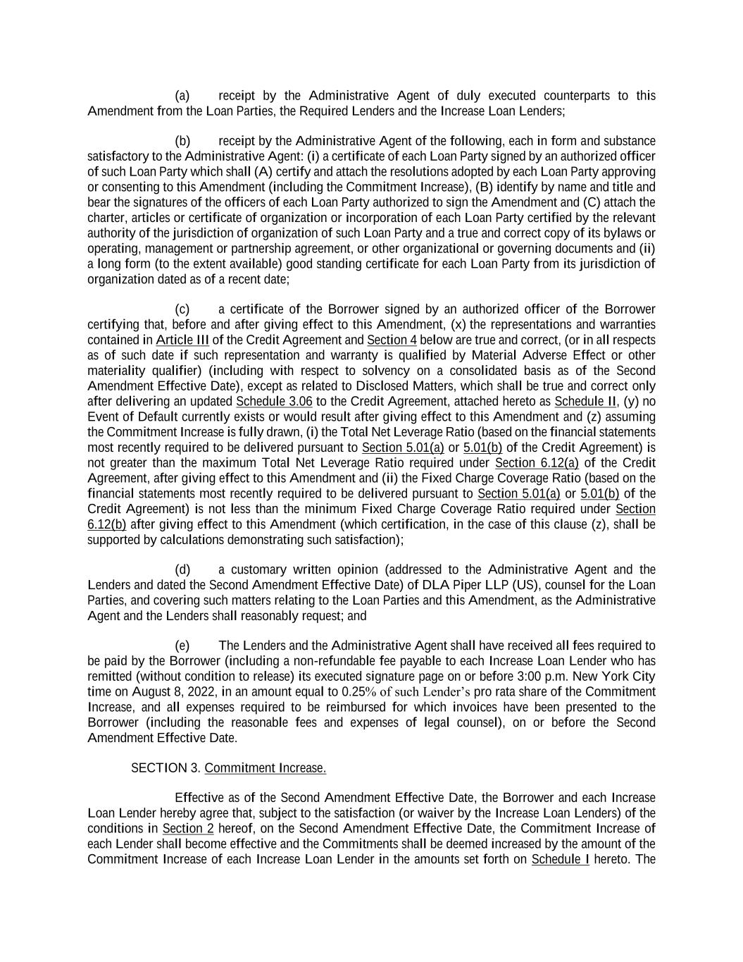 (a) receipt by the Administrative Agent of duly executed counterparts to this Amendment from the Loan Parties, the Required Lenders and the Increase Loan Lenders; (b) receipt by the Administrative Agent of the following, each in form and substance satisfactory to the Administrative Agent: (i) a certificate of each Loan Party signed by an authorized officer of such Loan Party which shall (A) certify and attach the resolutions adopted by each Loan Party approving or consenting to this Amendment (including the Commitment Increase), (B) identify by name and title and bear the signatures of the officers of each Loan Party authorized to sign the Amendment and (C) attach the charter, articles or certificate of organization or incorporation of each Loan Party certified by the relevant authority of the jurisdiction of organization of such Loan Party and a true and correct copy of its bylaws or operating, management or partnership agreement, or other organizational or governing documents and (ii) a long form (to the extent available) good standing certificate for each Loan Party from its jurisdiction of organization dated as of a recent date; (c) a certificate of the Borrower signed by an authorized officer of the Borrower certifying that, before and after giving effect to this Amendment, (x) the representations and warranties contained in Article III of the Credit Agreement and Section 4 below are true and correct, (or in all respects as of such date if such representation and warranty is qualified by Material Adverse Effect or other materiality qualifier) (including with respect to solvency on a consolidated basis as of the Second Amendment Effective Date), except as related to Disclosed Matters, which shall be true and correct only after delivering an updated Schedule 3.06 to the Credit Agreement, attached hereto as Schedule II, (y) no Event of Default currently exists or would result after giving effect to this Amendment and (z) assuming the Commitment Increase is fully drawn, (i) the Total Net Leverage Ratio (based on the financial statements most recently required to be delivered pursuant to Section 5.01(a) or 5.01(b) of the Credit Agreement) is not greater than the maximum Total Net Leverage Ratio required under Section 6.12(a) of the Credit Agreement, after giving effect to this Amendment and (ii) the Fixed Charge Coverage Ratio (based on the financial statements most recently required to be delivered pursuant to Section 5.01(a) or 5.01(b) of the Credit Agreement) is not less than the minimum Fixed Charge Coverage Ratio required under Section 6.12(b) after giving effect to this Amendment (which certification, in the case of this clause (z), shall be supported by calculations demonstrating such satisfaction); (d) a customary written opinion (addressed to the Administrative Agent and the Lenders and dated the Second Amendment Effective Date) of DLA Piper LLP (US), counsel for the Loan Parties, and covering such matters relating to the Loan Parties and this Amendment, as the Administrative Agent and the Lenders shall reasonably request; and (e) The Lenders and the Administrative Agent shall have received all fees required to be paid by the Borrower (including a non-refundable fee payable to each Increase Loan Lender who has remitted (without condition to release) its executed signature page on or before 3:00 p.m. New York City time on August 8, 2022, in an amount equal to 0.25% of such Lender’s pro rata share of the Commitment Increase, and all expenses required to be reimbursed for which invoices have been presented to the Borrower (including the reasonable fees and expenses of legal counsel), on or before the Second Amendment Effective Date. SECTION 3. Commitment Increase. Effective as of the Second Amendment Effective Date, the Borrower and each Increase Loan Lender hereby agree that, subject to the satisfaction (or waiver by the Increase Loan Lenders) of the conditions in Section 2 hereof, on the Second Amendment Effective Date, the Commitment Increase of each Lender shall become effective and the Commitments shall be deemed increased by the amount of the Commitment Increase of each Increase Loan Lender in the amounts set forth on Schedule I hereto. The