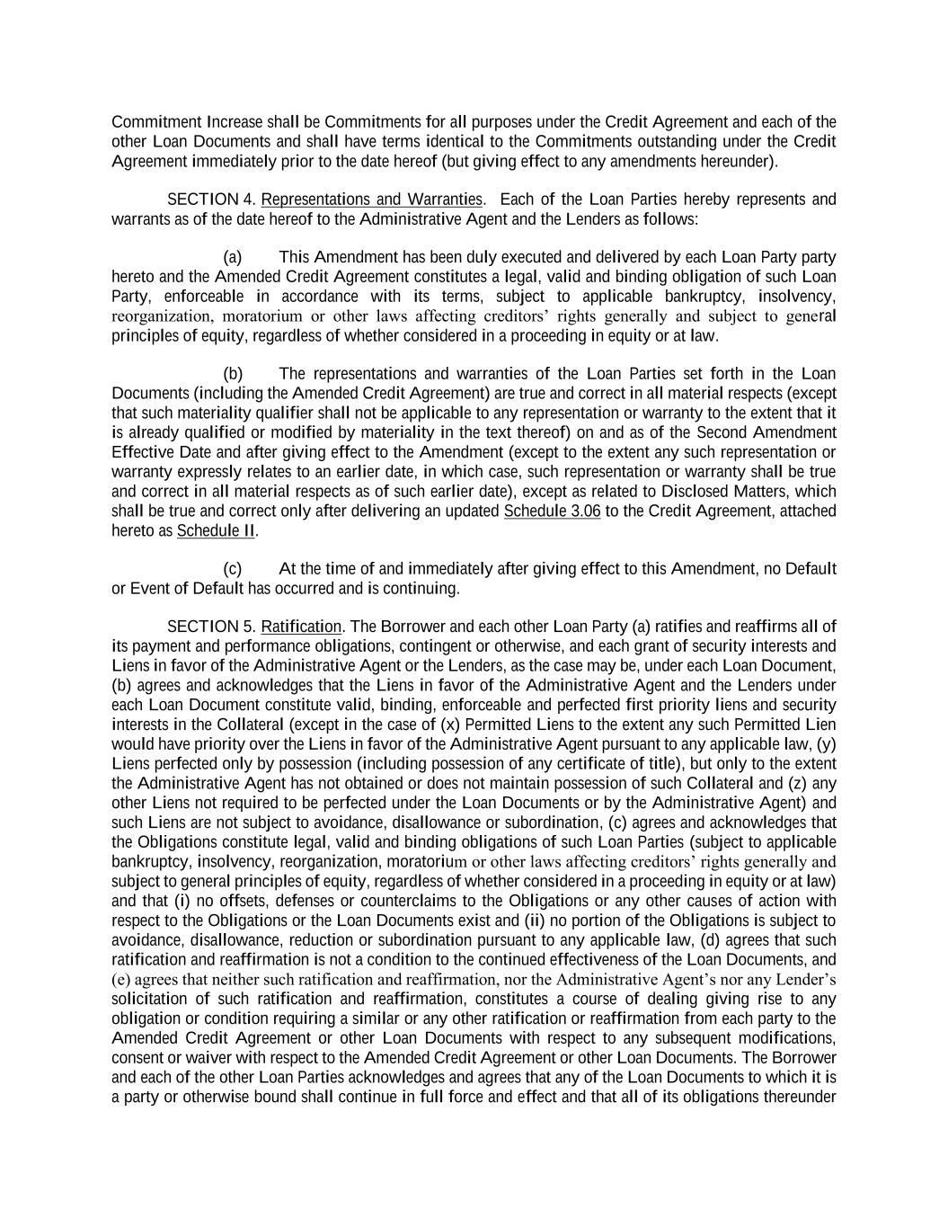 Commitment Increase shall be Commitments for all purposes under the Credit Agreement and each of the other Loan Documents and shall have terms identical to the Commitments outstanding under the Credit Agreement immediately prior to the date hereof (but giving effect to any amendments hereunder). SECTION 4. Representations and Warranties. Each of the Loan Parties hereby represents and warrants as of the date hereof to the Administrative Agent and the Lenders as follows: (a) This Amendment has been duly executed and delivered by each Loan Party party hereto and the Amended Credit Agreement constitutes a legal, valid and binding obligation of such Loan Party, enforceable in accordance with its terms, subject to applicable bankruptcy, insolvency, reorganization, moratorium or other laws affecting creditors’ rights generally and subject to general principles of equity, regardless of whether considered in a proceeding in equity or at law. (b) The representations and warranties of the Loan Parties set forth in the Loan Documents (including the Amended Credit Agreement) are true and correct in all material respects (except that such materiality qualifier shall not be applicable to any representation or warranty to the extent that it is already qualified or modified by materiality in the text thereof) on and as of the Second Amendment Effective Date and after giving effect to the Amendment (except to the extent any such representation or warranty expressly relates to an earlier date, in which case, such representation or warranty shall be true and correct in all material respects as of such earlier date), except as related to Disclosed Matters, which shall be true and correct only after delivering an updated Schedule 3.06 to the Credit Agreement, attached hereto as Schedule II. (c) At the time of and immediately after giving effect to this Amendment, no Default or Event of Default has occurred and is continuing. SECTION 5. Ratification. The Borrower and each other Loan Party (a) ratifies and reaffirms all of its payment and performance obligations, contingent or otherwise, and each grant of security interests and Liens in favor of the Administrative Agent or the Lenders, as the case may be, under each Loan Document, (b) agrees and acknowledges that the Liens in favor of the Administrative Agent and the Lenders under each Loan Document constitute valid, binding, enforceable and perfected first priority liens and security interests in the Collateral (except in the case of (x) Permitted Liens to the extent any such Permitted Lien would have priority over the Liens in favor of the Administrative Agent pursuant to any applicable law, (y) Liens perfected only by possession (including possession of any certificate of title), but only to the extent the Administrative Agent has not obtained or does not maintain possession of such Collateral and (z) any other Liens not required to be perfected under the Loan Documents or by the Administrative Agent) and such Liens are not subject to avoidance, disallowance or subordination, (c) agrees and acknowledges that the Obligations constitute legal, valid and binding obligations of such Loan Parties (subject to applicable bankruptcy, insolvency, reorganization, moratorium or other laws affecting creditors’ rights generally and subject to general principles of equity, regardless of whether considered in a proceeding in equity or at law) and that (i) no offsets, defenses or counterclaims to the Obligations or any other causes of action with respect to the Obligations or the Loan Documents exist and (ii) no portion of the Obligations is subject to avoidance, disallowance, reduction or subordination pursuant to any applicable law, (d) agrees that such ratification and reaffirmation is not a condition to the continued effectiveness of the Loan Documents, and (e) agrees that neither such ratification and reaffirmation, nor the Administrative Agent’s nor any Lender’s solicitation of such ratification and reaffirmation, constitutes a course of dealing giving rise to any obligation or condition requiring a similar or any other ratification or reaffirmation from each party to the Amended Credit Agreement or other Loan Documents with respect to any subsequent modifications, consent or waiver with respect to the Amended Credit Agreement or other Loan Documents. The Borrower and each of the other Loan Parties acknowledges and agrees that any of the Loan Documents to which it is a party or otherwise bound shall continue in full force and effect and that all of its obligations thereunder