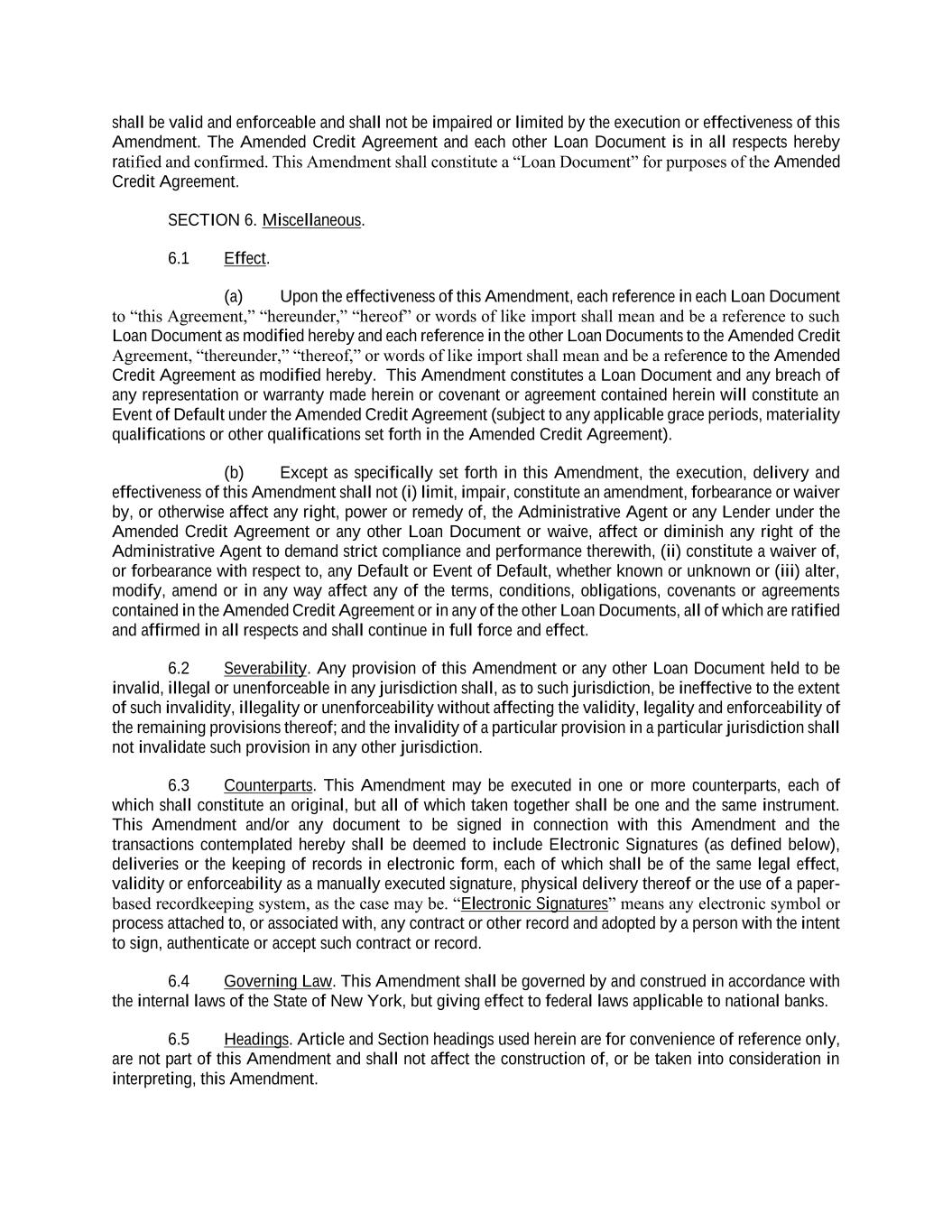 shall be valid and enforceable and shall not be impaired or limited by the execution or effectiveness of this Amendment. The Amended Credit Agreement and each other Loan Document is in all respects hereby ratified and confirmed. This Amendment shall constitute a “Loan Document” for purposes of the Amended Credit Agreement. SECTION 6. Miscellaneous. 6.1 Effect. (a) Upon the effectiveness of this Amendment, each reference in each Loan Document to “this Agreement,” “hereunder,” “hereof” or words of like import shall mean and be a reference to such Loan Document as modified hereby and each reference in the other Loan Documents to the Amended Credit Agreement, “thereunder,” “thereof,” or words of like import shall mean and be a reference to the Amended Credit Agreement as modified hereby. This Amendment constitutes a Loan Document and any breach of any representation or warranty made herein or covenant or agreement contained herein will constitute an Event of Default under the Amended Credit Agreement (subject to any applicable grace periods, materiality qualifications or other qualifications set forth in the Amended Credit Agreement). (b) Except as specifically set forth in this Amendment, the execution, delivery and effectiveness of this Amendment shall not (i) limit, impair, constitute an amendment, forbearance or waiver by, or otherwise affect any right, power or remedy of, the Administrative Agent or any Lender under the Amended Credit Agreement or any other Loan Document or waive, affect or diminish any right of the Administrative Agent to demand strict compliance and performance therewith, (ii) constitute a waiver of, or forbearance with respect to, any Default or Event of Default, whether known or unknown or (iii) alter, modify, amend or in any way affect any of the terms, conditions, obligations, covenants or agreements contained in the Amended Credit Agreement or in any of the other Loan Documents, all of which are ratified and affirmed in all respects and shall continue in full force and effect. 6.2 Severability. Any provision of this Amendment or any other Loan Document held to be invalid, illegal or unenforceable in any jurisdiction shall, as to such jurisdiction, be ineffective to the extent of such invalidity, illegality or unenforceability without affecting the validity, legality and enforceability of the remaining provisions thereof; and the invalidity of a particular provision in a particular jurisdiction shall not invalidate such provision in any other jurisdiction. 6.3 Counterparts. This Amendment may be executed in one or more counterparts, each of which shall constitute an original, but all of which taken together shall be one and the same instrument. This Amendment and/or any document to be signed in connection with this Amendment and the transactions contemplated hereby shall be deemed to include Electronic Signatures (as defined below), deliveries or the keeping of records in electronic form, each of which shall be of the same legal effect, validity or enforceability as a manually executed signature, physical delivery thereof or the use of a paper- based recordkeeping system, as the case may be. “Electronic Signatures” means any electronic symbol or process attached to, or associated with, any contract or other record and adopted by a person with the intent to sign, authenticate or accept such contract or record. 6.4 Governing Law. This Amendment shall be governed by and construed in accordance with the internal laws of the State of New York, but giving effect to federal laws applicable to national banks. 6.5 Headings. Article and Section headings used herein are for convenience of reference only, are not part of this Amendment and shall not affect the construction of, or be taken into consideration in interpreting, this Amendment.