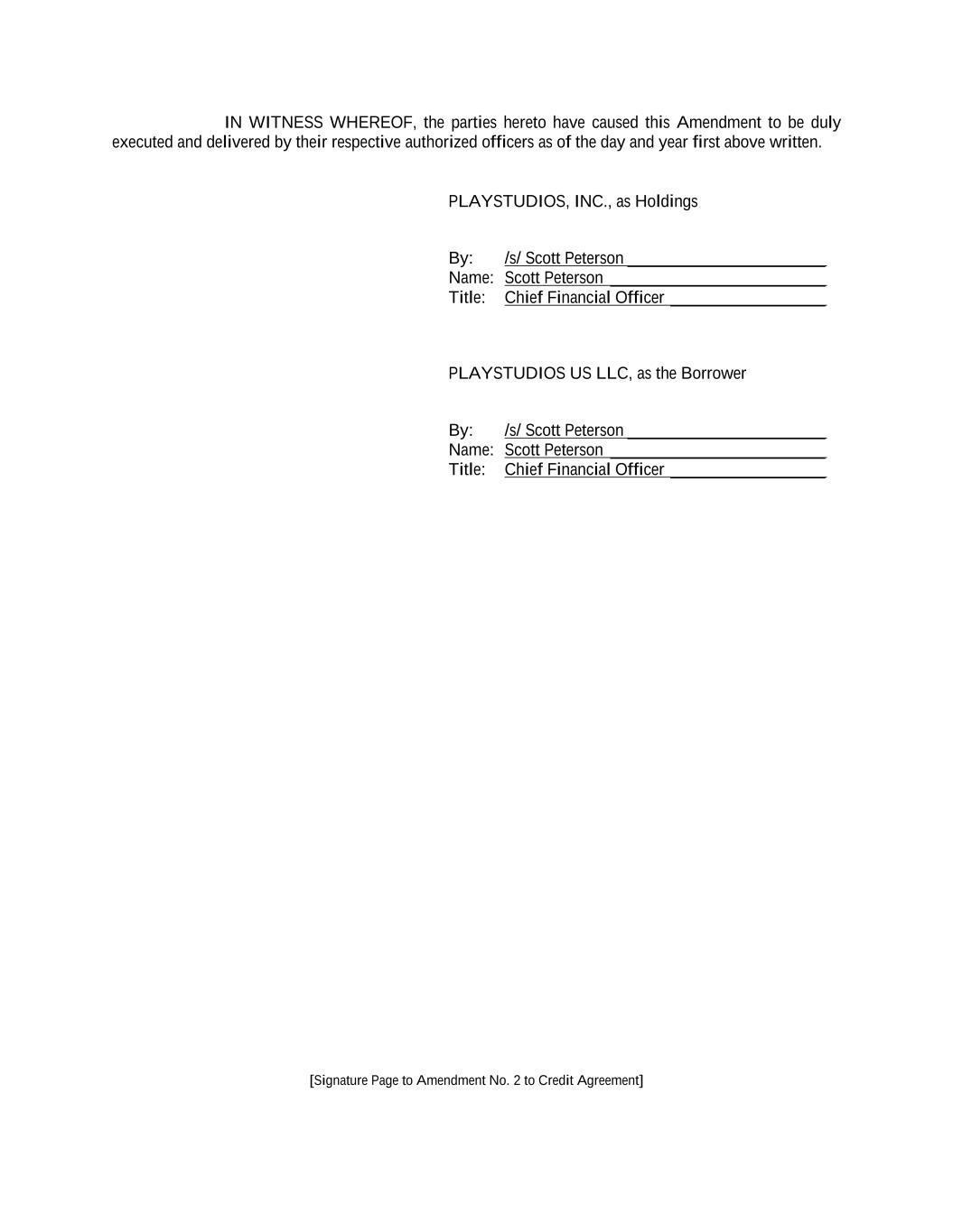 [Signature Page to Amendment No. 2 to Credit Agreement] IN WITNESS WHEREOF, the parties hereto have caused this Amendment to be duly executed and delivered by their respective authorized officers as of the day and year first above written. PLAYSTUDIOS, INC., as Holdings By: /s/ Scott Peterson _______________________ Name: Scott Peterson _________________________ Title: Chief Financial Officer __________________ PLAYSTUDIOS US LLC, as the Borrower By: /s/ Scott Peterson _______________________ Name: Scott Peterson _________________________ Title: Chief Financial Officer __________________
