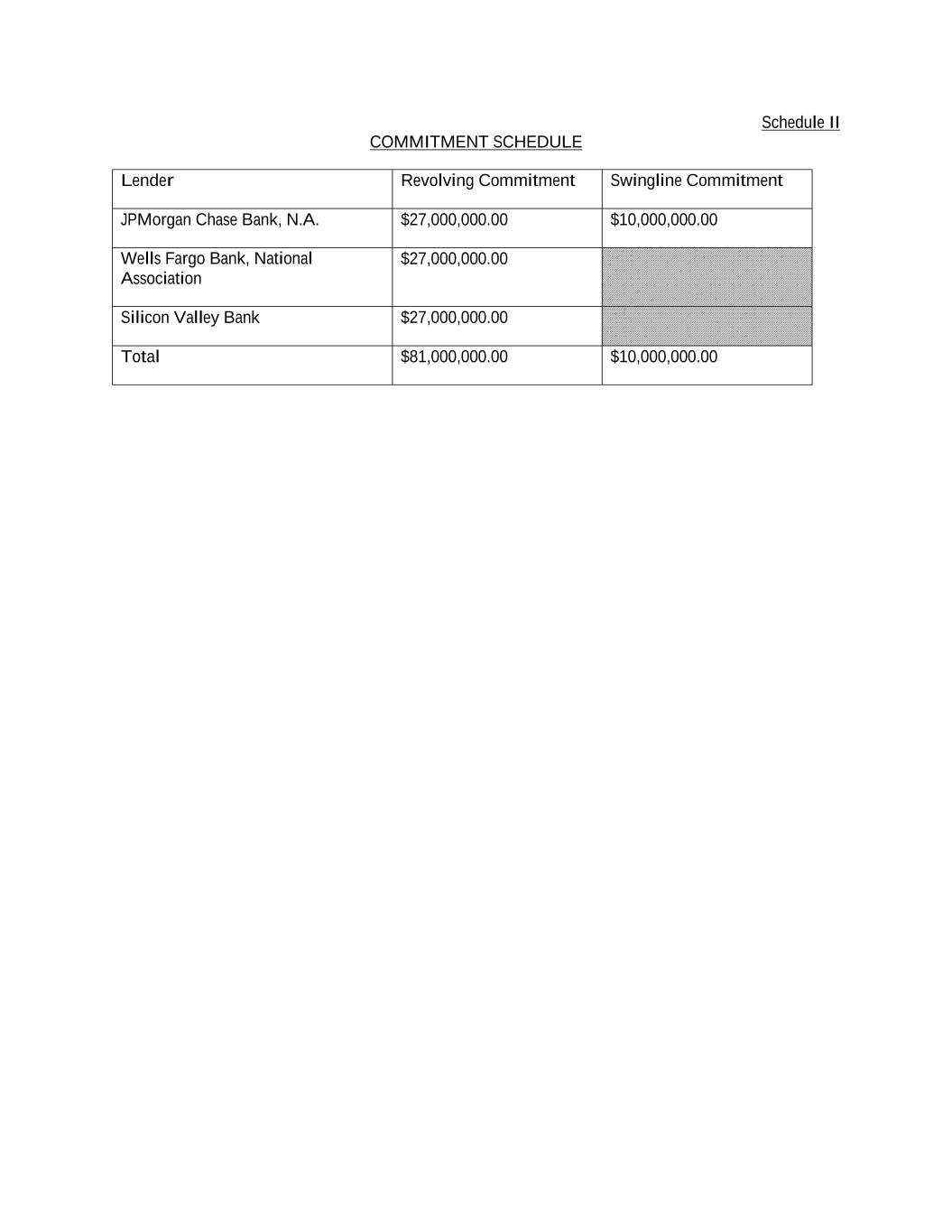 Schedule II COMMITMENT SCHEDULE Lender Revolving Commitment Swingline Commitment JPMorgan Chase Bank, N.A. $27,000,000.00 $10,000,000.00 Wells Fargo Bank, National Association $27,000,000.00 Silicon Valley Bank $27,000,000.00 Total $81,000,000.00 $10,000,000.00