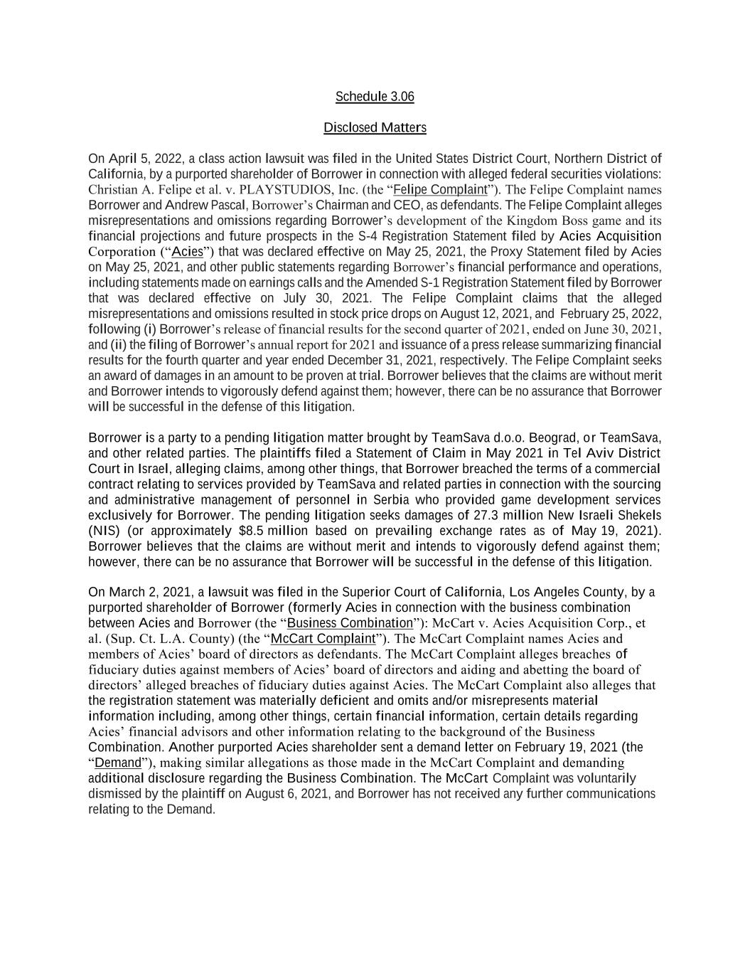Schedule 3.06 Disclosed Matters On April 5, 2022, a class action lawsuit was filed in the United States District Court, Northern District of California, by a purported shareholder of Borrower in connection with alleged federal securities violations: Christian A. Felipe et al. v. PLAYSTUDIOS, Inc. (the “Felipe Complaint”). The Felipe Complaint names Borrower and Andrew Pascal, Borrower’s Chairman and CEO, as defendants. The Felipe Complaint alleges misrepresentations and omissions regarding Borrower’s development of the Kingdom Boss game and its financial projections and future prospects in the S-4 Registration Statement filed by Acies Acquisition Corporation (“Acies”) that was declared effective on May 25, 2021, the Proxy Statement filed by Acies on May 25, 2021, and other public statements regarding Borrower’s financial performance and operations, including statements made on earnings calls and the Amended S-1 Registration Statement filed by Borrower that was declared effective on July 30, 2021. The Felipe Complaint claims that the alleged misrepresentations and omissions resulted in stock price drops on August 12, 2021, and February 25, 2022, following (i) Borrower’s release of financial results for the second quarter of 2021, ended on June 30, 2021, and (ii) the filing of Borrower’s annual report for 2021 and issuance of a press release summarizing financial results for the fourth quarter and year ended December 31, 2021, respectively. The Felipe Complaint seeks an award of damages in an amount to be proven at trial. Borrower believes that the claims are without merit and Borrower intends to vigorously defend against them; however, there can be no assurance that Borrower will be successful in the defense of this litigation. Borrower is a party to a pending litigation matter brought by TeamSava d.o.o. Beograd, or TeamSava, and other related parties. The plaintiffs filed a Statement of Claim in May 2021 in Tel Aviv District Court in Israel, alleging claims, among other things, that Borrower breached the terms of a commercial contract relating to services provided by TeamSava and related parties in connection with the sourcing and administrative management of personnel in Serbia who provided game development services exclusively for Borrower. The pending litigation seeks damages of 27.3 million New Israeli Shekels (NIS) (or approximately $8.5 million based on prevailing exchange rates as of May 19, 2021). Borrower believes that the claims are without merit and intends to vigorously defend against them; however, there can be no assurance that Borrower will be successful in the defense of this litigation. On March 2, 2021, a lawsuit was filed in the Superior Court of California, Los Angeles County, by a purported shareholder of Borrower (formerly Acies in connection with the business combination between Acies and Borrower (the “Business Combination”): McCart v. Acies Acquisition Corp., et al. (Sup. Ct. L.A. County) (the “McCart Complaint”). The McCart Complaint names Acies and members of Acies’ board of directors as defendants. The McCart Complaint alleges breaches of fiduciary duties against members of Acies’ board of directors and aiding and abetting the board of directors’ alleged breaches of fiduciary duties against Acies. The McCart Complaint also alleges that the registration statement was materially deficient and omits and/or misrepresents material information including, among other things, certain financial information, certain details regarding Acies’ financial advisors and other information relating to the background of the Business Combination. Another purported Acies shareholder sent a demand letter on February 19, 2021 (the “Demand”), making similar allegations as those made in the McCart Complaint and demanding additional disclosure regarding the Business Combination. The McCart Complaint was voluntarily dismissed by the plaintiff on August 6, 2021, and Borrower has not received any further communications relating to the Demand.
