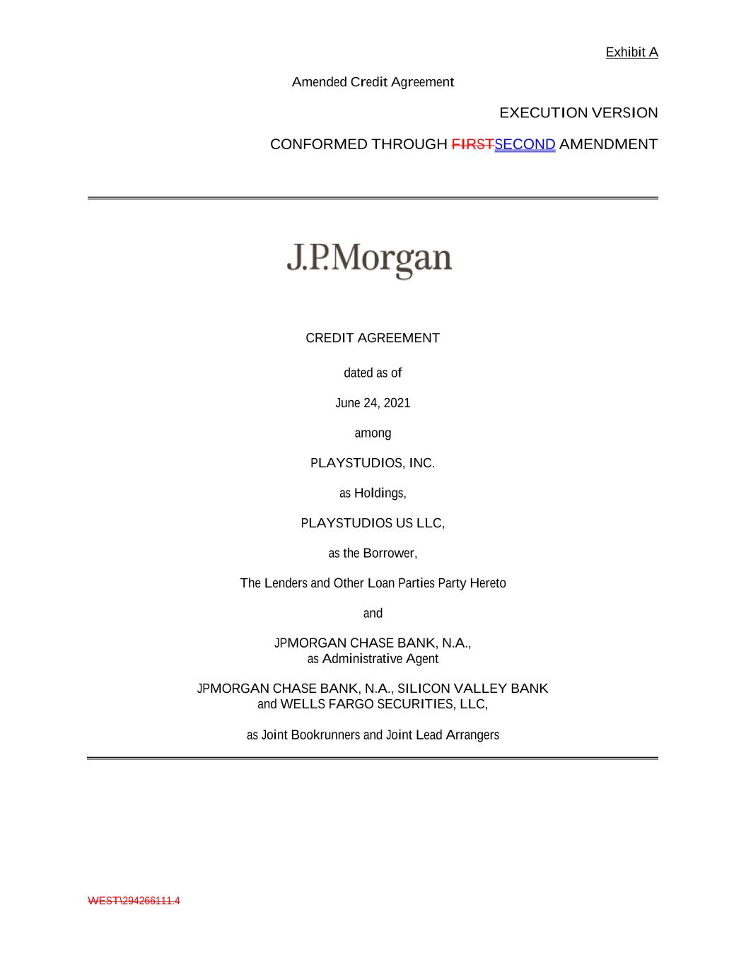 Exhibit A Amended Credit Agreement WEST\294266111.4 EXECUTION VERSION CONFORMED THROUGH FIRSTSECOND AMENDMENT CREDIT AGREEMENT dated as of June 24, 2021 among PLAYSTUDIOS, INC. as Holdings, PLAYSTUDIOS US LLC, as the Borrower, The Lenders and Other Loan Parties Party Hereto and JPMORGAN CHASE BANK, N.A., as Administrative Agent JPMORGAN CHASE BANK, N.A., SILICON VALLEY BANK and WELLS FARGO SECURITIES, LLC, as Joint Bookrunners and Joint Lead Arrangers