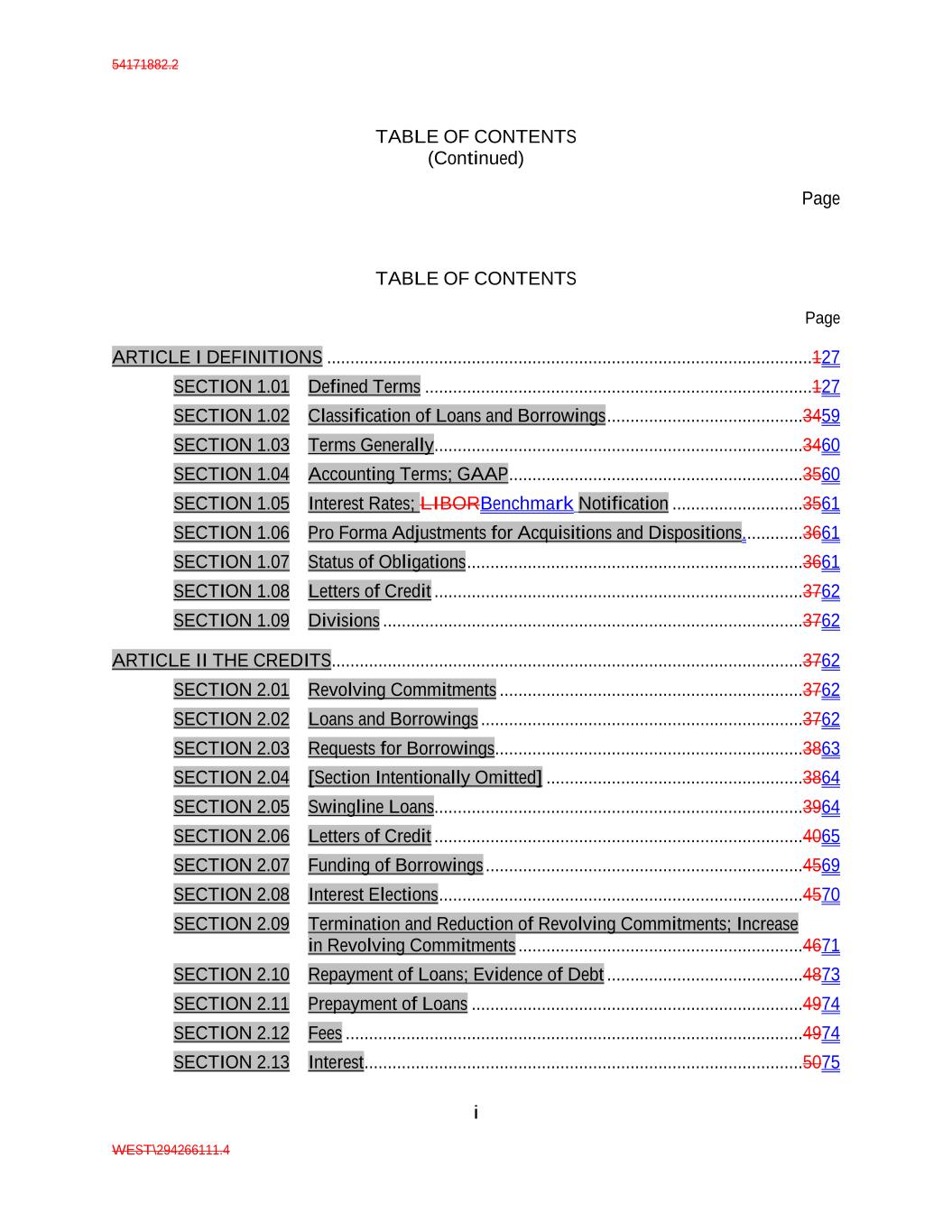 54171882.2 TABLE OF CONTENTS (Continued) Page i WEST\294266111.4 TABLE OF CONTENTS Page ARTICLE I DEFINITIONS ........................................................................................................127 SECTION 1.01 Defined Terms ...................................................................................127 SECTION 1.02 Classification of Loans and Borrowings ..........................................3459 SECTION 1.03 Terms Generally...............................................................................3460 SECTION 1.04 Accounting Terms; GAAP ...............................................................3560 SECTION 1.05 Interest Rates; LIBORBenchmark Notification ............................3561 SECTION 1.06 Pro Forma Adjustments for Acquisitions and Dispositions. ............3661 SECTION 1.07 Status of Obligations ........................................................................3661 SECTION 1.08 Letters of Credit ...............................................................................3762 SECTION 1.09 Divisions ..........................................................................................3762 ARTICLE II THE CREDITS.....................................................................................................3762 SECTION 2.01 Revolving Commitments .................................................................3762 SECTION 2.02 Loans and Borrowings .....................................................................3762 SECTION 2.03 Requests for Borrowings..................................................................3863 SECTION 2.04 [Section Intentionally Omitted] .......................................................3864 SECTION 2.05 Swingline Loans...............................................................................3964 SECTION 2.06 Letters of Credit ...............................................................................4065 SECTION 2.07 Funding of Borrowings ....................................................................4569 SECTION 2.08 Interest Elections ..............................................................................4570 SECTION 2.09 Termination and Reduction of Revolving Commitments; Increase in Revolving Commitments .............................................................4671 SECTION 2.10 Repayment of Loans; Evidence of Debt ..........................................4873 SECTION 2.11 Prepayment of Loans .......................................................................4974 SECTION 2.12 Fees ..................................................................................................4974 SECTION 2.13 Interest..............................................................................................5075