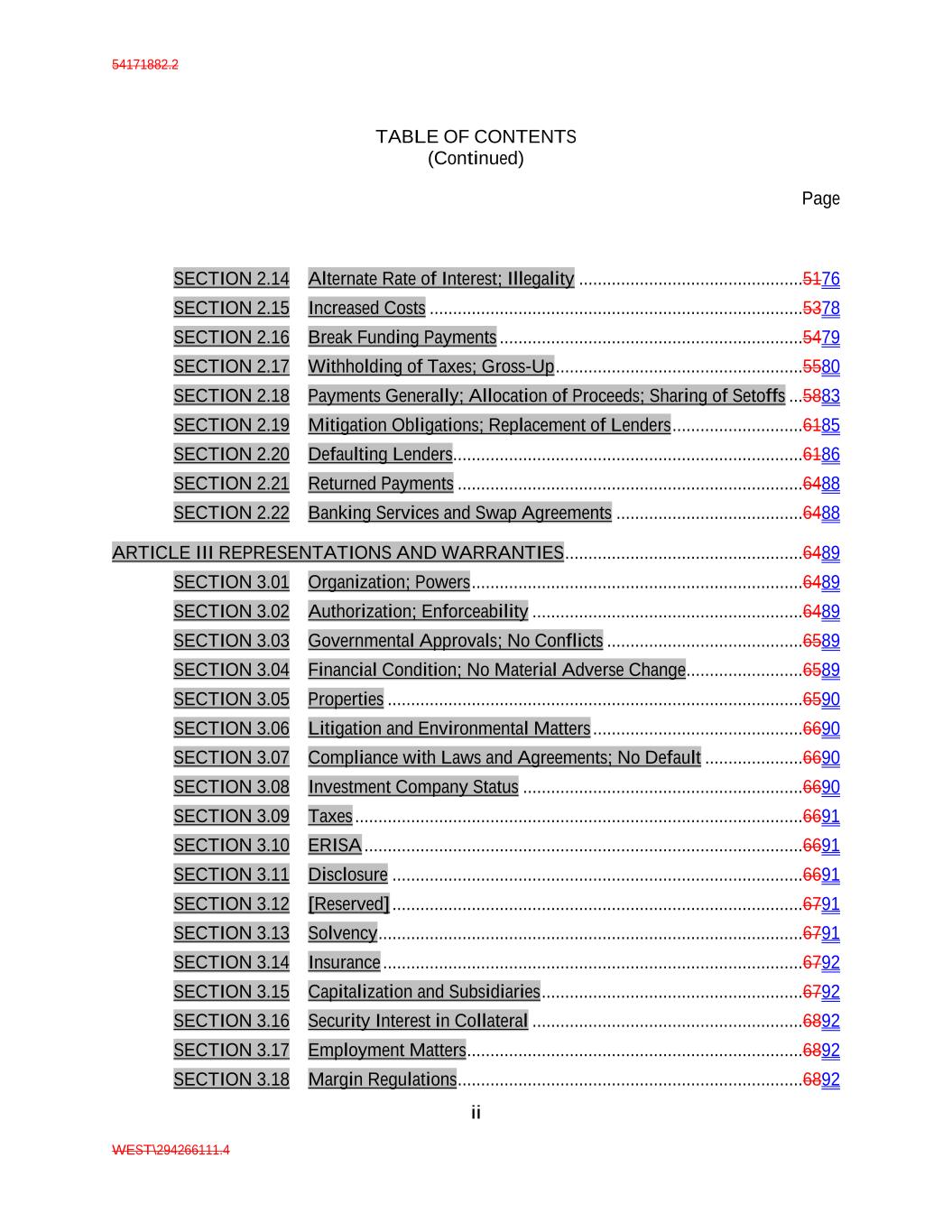 54171882.2 TABLE OF CONTENTS (Continued) Page ii WEST\294266111.4 SECTION 2.14 Alternate Rate of Interest; Illegality ................................................5176 SECTION 2.15 Increased Costs ................................................................................5378 SECTION 2.16 Break Funding Payments .................................................................5479 SECTION 2.17 Withholding of Taxes; Gross-Up .....................................................5580 SECTION 2.18 Payments Generally; Allocation of Proceeds; Sharing of Setoffs ...5883 SECTION 2.19 Mitigation Obligations; Replacement of Lenders ............................6185 SECTION 2.20 Defaulting Lenders...........................................................................6186 SECTION 2.21 Returned Payments ..........................................................................6488 SECTION 2.22 Banking Services and Swap Agreements ........................................6488 ARTICLE III REPRESENTATIONS AND WARRANTIES ...................................................6489 SECTION 3.01 Organization; Powers .......................................................................6489 SECTION 3.02 Authorization; Enforceability ..........................................................6489 SECTION 3.03 Governmental Approvals; No Conflicts ..........................................6589 SECTION 3.04 Financial Condition; No Material Adverse Change .........................6589 SECTION 3.05 Properties .........................................................................................6590 SECTION 3.06 Litigation and Environmental Matters .............................................6690 SECTION 3.07 Compliance with Laws and Agreements; No Default .....................6690 SECTION 3.08 Investment Company Status ............................................................6690 SECTION 3.09 Taxes ................................................................................................6691 SECTION 3.10 ERISA ..............................................................................................6691 SECTION 3.11 Disclosure ........................................................................................6691 SECTION 3.12 [Reserved] ........................................................................................6791 SECTION 3.13 Solvency ...........................................................................................6791 SECTION 3.14 Insurance ..........................................................................................6792 SECTION 3.15 Capitalization and Subsidiaries ........................................................6792 SECTION 3.16 Security Interest in Collateral ..........................................................6892 SECTION 3.17 Employment Matters ........................................................................6892 SECTION 3.18 Margin Regulations ..........................................................................6892