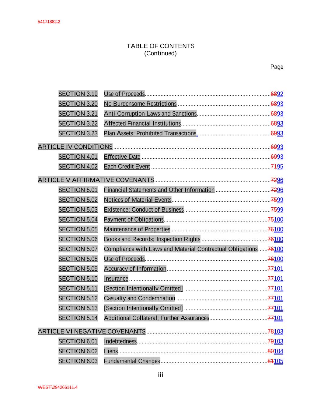 54171882.2 TABLE OF CONTENTS (Continued) Page iii WEST\294266111.4 SECTION 3.19 Use of Proceeds................................................................................6892 SECTION 3.20 No Burdensome Restrictions ...........................................................6893 SECTION 3.21 Anti-Corruption Laws and Sanctions...............................................6893 SECTION 3.22 Affected Financial Institutions .........................................................6893 SECTION 3.23 Plan Assets; Prohibited Transactions. ..............................................6993 ARTICLE IV CONDITIONS ....................................................................................................6993 SECTION 4.01 Effective Date ..................................................................................6993 SECTION 4.02 Each Credit Event ............................................................................7195 ARTICLE V AFFIRMATIVE COVENANTS ..........................................................................7296 SECTION 5.01 Financial Statements and Other Information ...................................7296 SECTION 5.02 Notices of Material Events...............................................................7599 SECTION 5.03 Existence; Conduct of Business .......................................................7599 SECTION 5.04 Payment of Obligations..................................................................75100 SECTION 5.05 Maintenance of Properties .............................................................76100 SECTION 5.06 Books and Records; Inspection Rights ..........................................76100 SECTION 5.07 Compliance with Laws and Material Contractual Obligations ......76100 SECTION 5.08 Use of Proceeds..............................................................................76100 SECTION 5.09 Accuracy of Information ................................................................77101 SECTION 5.10 Insurance ........................................................................................77101 SECTION 5.11 [Section Intentionally Omitted] .....................................................77101 SECTION 5.12 Casualty and Condemnation ..........................................................77101 SECTION 5.13 [Section Intentionally Omitted] .....................................................77101 SECTION 5.14 Additional Collateral; Further Assurances .....................................77101 ARTICLE VI NEGATIVE COVENANTS .............................................................................78103 SECTION 6.01 Indebtedness ...................................................................................79103 SECTION 6.02 Liens ...............................................................................................80104 SECTION 6.03 Fundamental Changes ....................................................................81105