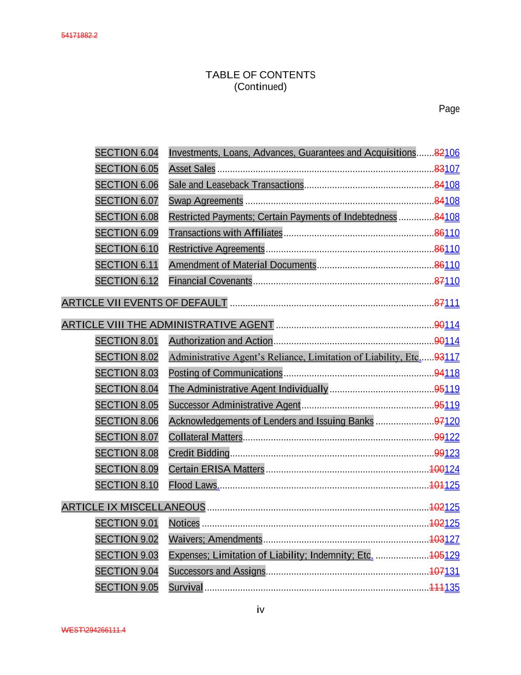 54171882.2 TABLE OF CONTENTS (Continued) Page iv WEST\294266111.4 SECTION 6.04 Investments, Loans, Advances, Guarantees and Acquisitions .......82106 SECTION 6.05 Asset Sales .....................................................................................83107 SECTION 6.06 Sale and Leaseback Transactions ...................................................84108 SECTION 6.07 Swap Agreements ..........................................................................84108 SECTION 6.08 Restricted Payments; Certain Payments of Indebtedness ..............84108 SECTION 6.09 Transactions with Affiliates ...........................................................86110 SECTION 6.10 Restrictive Agreements ..................................................................86110 SECTION 6.11 Amendment of Material Documents ..............................................86110 SECTION 6.12 Financial Covenants .......................................................................87110 ARTICLE VII EVENTS OF DEFAULT ................................................................................87111 ARTICLE VIII THE ADMINISTRATIVE AGENT ..............................................................90114 SECTION 8.01 Authorization and Action ...............................................................90114 SECTION 8.02 Administrative Agent’s Reliance, Limitation of Liability, Etc......93117 SECTION 8.03 Posting of Communications ...........................................................94118 SECTION 8.04 The Administrative Agent Individually .........................................95119 SECTION 8.05 Successor Administrative Agent ....................................................95119 SECTION 8.06 Acknowledgements of Lenders and Issuing Banks .......................97120 SECTION 8.07 Collateral Matters...........................................................................99122 SECTION 8.08 Credit Bidding ................................................................................99123 SECTION 8.09 Certain ERISA Matters ................................................................100124 SECTION 8.10 Flood Laws...................................................................................101125 ARTICLE IX MISCELLANEOUS .......................................................................................102125 SECTION 9.01 Notices .........................................................................................102125 SECTION 9.02 Waivers; Amendments .................................................................103127 SECTION 9.03 Expenses; Limitation of Liability; Indemnity; Etc. .....................105129 SECTION 9.04 Successors and Assigns................................................................107131 SECTION 9.05 Survival ........................................................................................111135