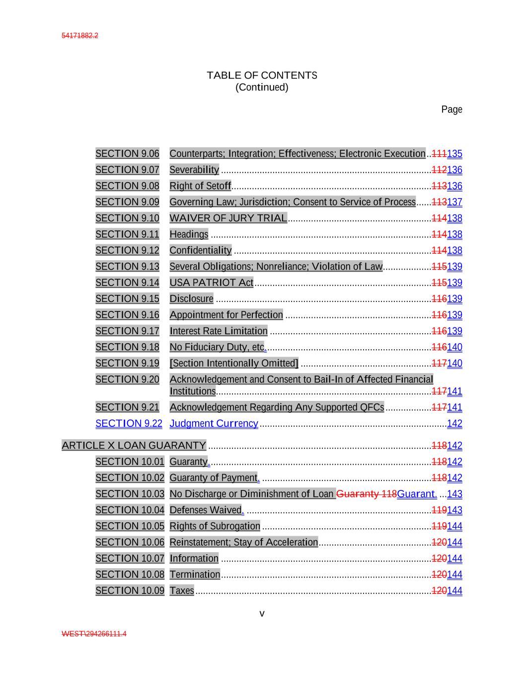 54171882.2 TABLE OF CONTENTS (Continued) Page v WEST\294266111.4 SECTION 9.06 Counterparts; Integration; Effectiveness; Electronic Execution ..111135 SECTION 9.07 Severability ..................................................................................112136 SECTION 9.08 Right of Setoff..............................................................................113136 SECTION 9.09 Governing Law; Jurisdiction; Consent to Service of Process ......113137 SECTION 9.10 WAIVER OF JURY TRIAL ........................................................114138 SECTION 9.11 Headings ......................................................................................114138 SECTION 9.12 Confidentiality .............................................................................114138 SECTION 9.13 Several Obligations; Nonreliance; Violation of Law...................115139 SECTION 9.14 USA PATRIOT Act .....................................................................115139 SECTION 9.15 Disclosure ....................................................................................116139 SECTION 9.16 Appointment for Perfection .........................................................116139 SECTION 9.17 Interest Rate Limitation ...............................................................116139 SECTION 9.18 No Fiduciary Duty, etc. ................................................................116140 SECTION 9.19 [Section Intentionally Omitted] ...................................................117140 SECTION 9.20 Acknowledgement and Consent to Bail-In of Affected Financial Institutions....................................................................................117141 SECTION 9.21 Acknowledgement Regarding Any Supported QFCs ..................117141 SECTION 9.22 Judgment Currency .........................................................................142 ARTICLE X LOAN GUARANTY .......................................................................................118142 SECTION 10.01 Guaranty. ......................................................................................118142 SECTION 10.02 Guaranty of Payment. ..................................................................118142 SECTION 10.03 No Discharge or Diminishment of Loan Guaranty 118Guarant. ...143 SECTION 10.04 Defenses Waived. ........................................................................119143 SECTION 10.05 Rights of Subrogation ..................................................................119144 SECTION 10.06 Reinstatement; Stay of Acceleration ............................................120144 SECTION 10.07 Information ..................................................................................120144 SECTION 10.08 Termination ..................................................................................120144 SECTION 10.09 Taxes ............................................................................................120144