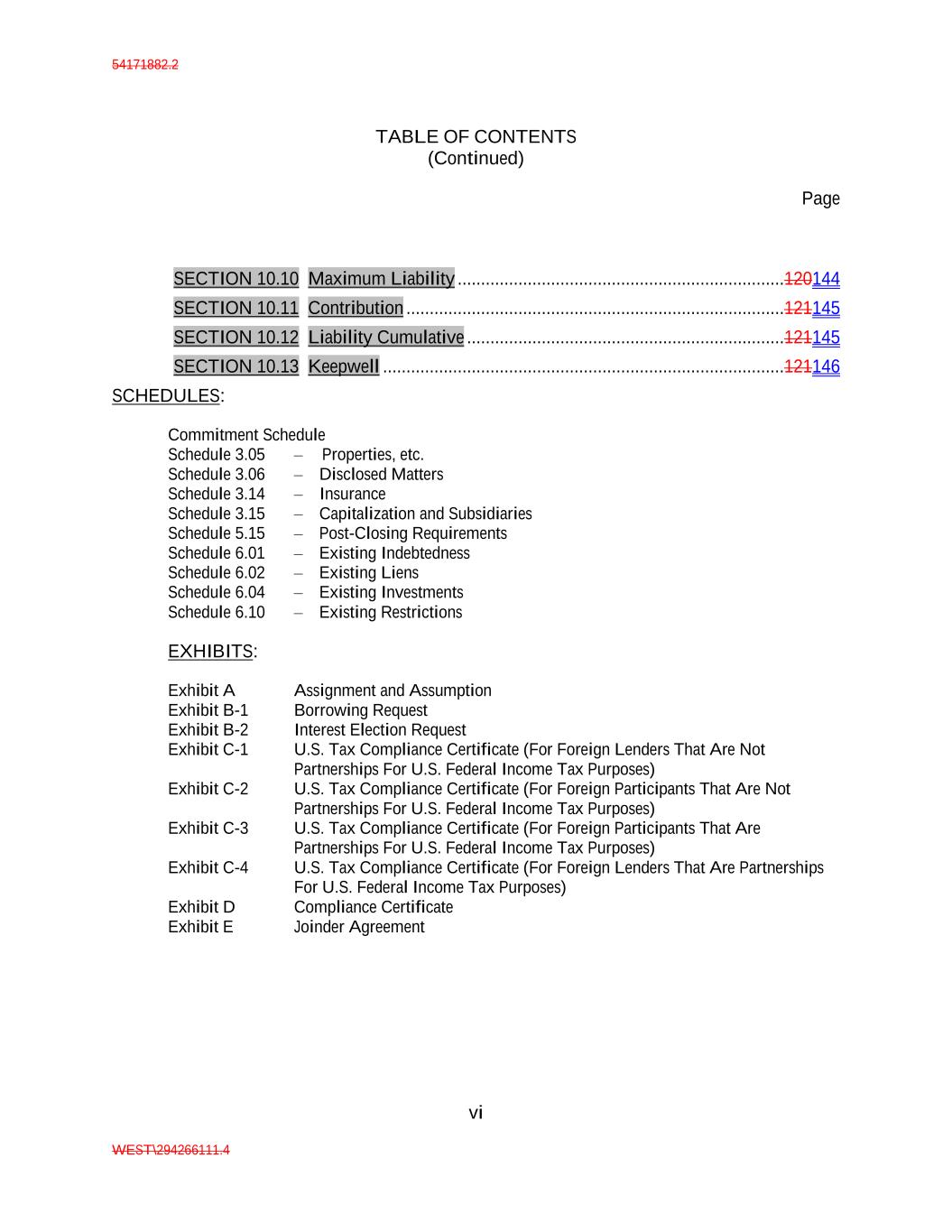 54171882.2 TABLE OF CONTENTS (Continued) Page vi WEST\294266111.4 SECTION 10.10 Maximum Liability ......................................................................120144 SECTION 10.11 Contribution .................................................................................121145 SECTION 10.12 Liability Cumulative ....................................................................121145 SECTION 10.13 Keepwell ......................................................................................121146 SCHEDULES: Commitment Schedule Schedule 3.05 – Properties, etc. Schedule 3.06 – Disclosed Matters Schedule 3.14 – Insurance Schedule 3.15 – Capitalization and Subsidiaries Schedule 5.15 – Post-Closing Requirements Schedule 6.01 – Existing Indebtedness Schedule 6.02 – Existing Liens Schedule 6.04 – Existing Investments Schedule 6.10 – Existing Restrictions EXHIBITS: Exhibit A Assignment and Assumption Exhibit B-1 Borrowing Request Exhibit B-2 Interest Election Request Exhibit C-1 U.S. Tax Compliance Certificate (For Foreign Lenders That Are Not Partnerships For U.S. Federal Income Tax Purposes) Exhibit C-2 U.S. Tax Compliance Certificate (For Foreign Participants That Are Not Partnerships For U.S. Federal Income Tax Purposes) Exhibit C-3 U.S. Tax Compliance Certificate (For Foreign Participants That Are Partnerships For U.S. Federal Income Tax Purposes) Exhibit C-4 U.S. Tax Compliance Certificate (For Foreign Lenders That Are Partnerships For U.S. Federal Income Tax Purposes) Exhibit D Compliance Certificate Exhibit E Joinder Agreement