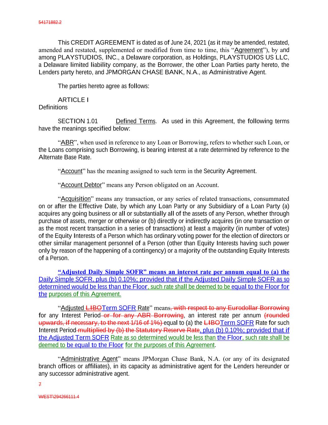 54171882.2 7 WEST\294266111.4 This CREDIT AGREEMENT is dated as of June 24, 2021 (as it may be amended, restated, amended and restated, supplemented or modified from time to time, this “Agreement”), by and among PLAYSTUDIOS, INC., a Delaware corporation, as Holdings, PLAYSTUDIOS US LLC, a Delaware limited liability company, as the Borrower, the other Loan Parties party hereto, the Lenders party hereto, and JPMORGAN CHASE BANK, N.A., as Administrative Agent. The parties hereto agree as follows: ARTICLE I Definitions SECTION 1.01 Defined Terms. As used in this Agreement, the following terms have the meanings specified below: “ABR”, when used in reference to any Loan or Borrowing, refers to whether such Loan, or the Loans comprising such Borrowing, is bearing interest at a rate determined by reference to the Alternate Base Rate. “Account” has the meaning assigned to such term in the Security Agreement. “Account Debtor” means any Person obligated on an Account. “Acquisition” means any transaction, or any series of related transactions, consummated on or after the Effective Date, by which any Loan Party or any Subsidiary of a Loan Party (a) acquires any going business or all or substantially all of the assets of any Person, whether through purchase of assets, merger or otherwise or (b) directly or indirectly acquires (in one transaction or as the most recent transaction in a series of transactions) at least a majority (in number of votes) of the Equity Interests of a Person which has ordinary voting power for the election of directors or other similar management personnel of a Person (other than Equity Interests having such power only by reason of the happening of a contingency) or a majority of the outstanding Equity Interests of a Person. “Adjusted Daily Simple SOFR” means an interest rate per annum equal to (a) the Daily Simple SOFR, plus (b) 0.10%; provided that if the Adjusted Daily Simple SOFR as so determined would be less than the Floor, such rate shall be deemed to be equal to the Floor for the purposes of this Agreement. “Adjusted LIBOTerm SOFR Rate” means, with respect to any Eurodollar Borrowing for any Interest Period or for any ABR Borrowing, an interest rate per annum (rounded upwards, if necessary, to the next 1/16 of 1%) equal to (a) the LIBOTerm SOFR Rate for such Interest Period multiplied by (b) the Statutory Reserve Rate, plus (b) 0.10%; provided that if the Adjusted Term SOFR Rate as so determined would be less than the Floor, such rate shall be deemed to be equal to the Floor for the purposes of this Agreement. “Administrative Agent” means JPMorgan Chase Bank, N.A. (or any of its designated branch offices or affiliates), in its capacity as administrative agent for the Lenders hereunder or any successor administrative agent.