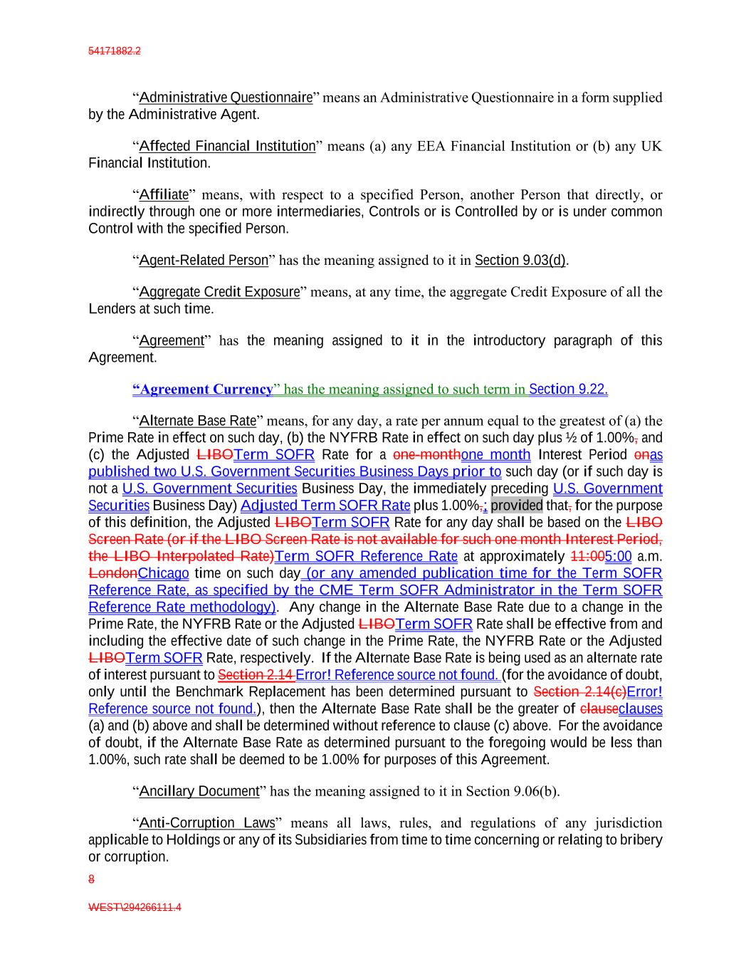 54171882.2 8 WEST\294266111.4 “Administrative Questionnaire” means an Administrative Questionnaire in a form supplied by the Administrative Agent. “Affected Financial Institution” means (a) any EEA Financial Institution or (b) any UK Financial Institution. “Affiliate” means, with respect to a specified Person, another Person that directly, or indirectly through one or more intermediaries, Controls or is Controlled by or is under common Control with the specified Person. “Agent-Related Person” has the meaning assigned to it in Section 9.03(d). “Aggregate Credit Exposure” means, at any time, the aggregate Credit Exposure of all the Lenders at such time. “Agreement” has the meaning assigned to it in the introductory paragraph of this Agreement. “Agreement Currency” has the meaning assigned to such term in Section 9.22. “Alternate Base Rate” means, for any day, a rate per annum equal to the greatest of (a) the Prime Rate in effect on such day, (b) the NYFRB Rate in effect on such day plus ½ of 1.00%, and (c) the Adjusted LIBOTerm SOFR Rate for a one-monthone month Interest Period onas published two U.S. Government Securities Business Days prior to such day (or if such day is not a U.S. Government Securities Business Day, the immediately preceding U.S. Government Securities Business Day) Adjusted Term SOFR Rate plus 1.00%,; provided that, for the purpose of this definition, the Adjusted LIBOTerm SOFR Rate for any day shall be based on the LIBO Screen Rate (or if the LIBO Screen Rate is not available for such one month Interest Period, the LIBO Interpolated Rate)Term SOFR Reference Rate at approximately 11:005:00 a.m. LondonChicago time on such day (or any amended publication time for the Term SOFR Reference Rate, as specified by the CME Term SOFR Administrator in the Term SOFR Reference Rate methodology). Any change in the Alternate Base Rate due to a change in the Prime Rate, the NYFRB Rate or the Adjusted LIBOTerm SOFR Rate shall be effective from and including the effective date of such change in the Prime Rate, the NYFRB Rate or the Adjusted LIBOTerm SOFR Rate, respectively. If the Alternate Base Rate is being used as an alternate rate of interest pursuant to Section 2.14 Error! Reference source not found. (for the avoidance of doubt, only until the Benchmark Replacement has been determined pursuant to Section 2.14(c)Error! Reference source not found.), then the Alternate Base Rate shall be the greater of clauseclauses (a) and (b) above and shall be determined without reference to clause (c) above. For the avoidance of doubt, if the Alternate Base Rate as determined pursuant to the foregoing would be less than 1.00%, such rate shall be deemed to be 1.00% for purposes of this Agreement. “Ancillary Document” has the meaning assigned to it in Section 9.06(b). “Anti-Corruption Laws” means all laws, rules, and regulations of any jurisdiction applicable to Holdings or any of its Subsidiaries from time to time concerning or relating to bribery or corruption.