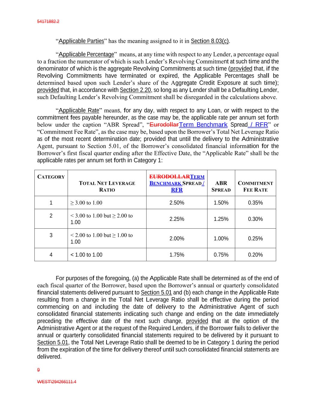 54171882.2 9 WEST\294266111.4 “Applicable Parties” has the meaning assigned to it in Section 8.03(c). “Applicable Percentage” means, at any time with respect to any Lender, a percentage equal to a fraction the numerator of which is such Lender’s Revolving Commitment at such time and the denominator of which is the aggregate Revolving Commitments at such time (provided that, if the Revolving Commitments have terminated or expired, the Applicable Percentages shall be determined based upon such Lender’s share of the Aggregate Credit Exposure at such time); provided that, in accordance with Section 2.20, so long as any Lender shall be a Defaulting Lender, such Defaulting Lender’s Revolving Commitment shall be disregarded in the calculations above. “Applicable Rate” means, for any day, with respect to any Loan, or with respect to the commitment fees payable hereunder, as the case may be, the applicable rate per annum set forth below under the caption “ABR Spread”, “EurodollarTerm Benchmark Spread / RFR” or “Commitment Fee Rate”, as the case may be, based upon the Borrower’s Total Net Leverage Ratio as of the most recent determination date; provided that until the delivery to the Administrative Agent, pursuant to Section 5.01, of the Borrower’s consolidated financial information for the Borrower’s first fiscal quarter ending after the Effective Date, the “Applicable Rate” shall be the applicable rates per annum set forth in Category 1: CATEGORY TOTAL NET LEVERAGE RATIO EURODOLLARTERM BENCHMARK SPREAD / RFR ABR SPREAD COMMITMENT FEE RATE 1 ≥ 3.00 to 1.00 2.50% 1.50% 0.35% 2 < 3.00 to 1.00 but ≥ 2.00 to 1.00 2.25% 1.25% 0.30% 3 < 2.00 to 1.00 but ≥ 1.00 to 1.00 2.00% 1.00% 0.25% 4 < 1.00 to 1.00 1.75% 0.75% 0.20% For purposes of the foregoing, (a) the Applicable Rate shall be determined as of the end of each fiscal quarter of the Borrower, based upon the Borrower’s annual or quarterly consolidated financial statements delivered pursuant to Section 5.01 and (b) each change in the Applicable Rate resulting from a change in the Total Net Leverage Ratio shall be effective during the period commencing on and including the date of delivery to the Administrative Agent of such consolidated financial statements indicating such change and ending on the date immediately preceding the effective date of the next such change, provided that at the option of the Administrative Agent or at the request of the Required Lenders, if the Borrower fails to deliver the annual or quarterly consolidated financial statements required to be delivered by it pursuant to Section 5.01, the Total Net Leverage Ratio shall be deemed to be in Category 1 during the period from the expiration of the time for delivery thereof until such consolidated financial statements are delivered.
