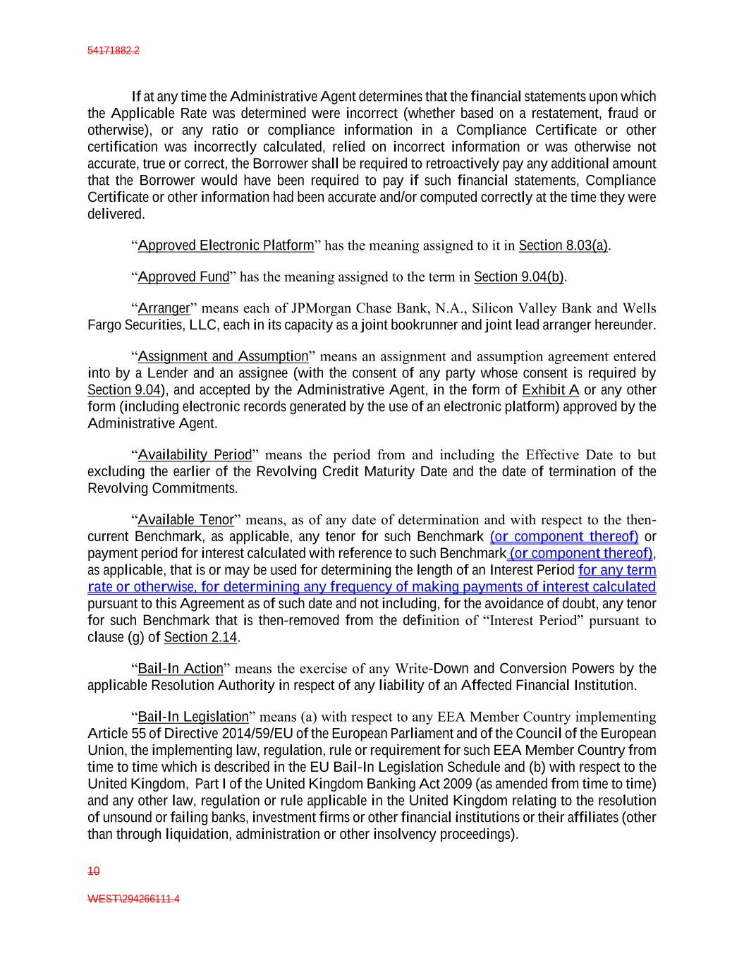 54171882.2 10 WEST\294266111.4 If at any time the Administrative Agent determines that the financial statements upon which the Applicable Rate was determined were incorrect (whether based on a restatement, fraud or otherwise), or any ratio or compliance information in a Compliance Certificate or other certification was incorrectly calculated, relied on incorrect information or was otherwise not accurate, true or correct, the Borrower shall be required to retroactively pay any additional amount that the Borrower would have been required to pay if such financial statements, Compliance Certificate or other information had been accurate and/or computed correctly at the time they were delivered. “Approved Electronic Platform” has the meaning assigned to it in Section 8.03(a). “Approved Fund” has the meaning assigned to the term in Section 9.04(b). “Arranger” means each of JPMorgan Chase Bank, N.A., Silicon Valley Bank and Wells Fargo Securities, LLC, each in its capacity as a joint bookrunner and joint lead arranger hereunder. “Assignment and Assumption” means an assignment and assumption agreement entered into by a Lender and an assignee (with the consent of any party whose consent is required by Section 9.04), and accepted by the Administrative Agent, in the form of Exhibit A or any other form (including electronic records generated by the use of an electronic platform) approved by the Administrative Agent. “Availability Period” means the period from and including the Effective Date to but excluding the earlier of the Revolving Credit Maturity Date and the date of termination of the Revolving Commitments. “Available Tenor” means, as of any date of determination and with respect to the then- current Benchmark, as applicable, any tenor for such Benchmark (or component thereof) or payment period for interest calculated with reference to such Benchmark (or component thereof), as applicable, that is or may be used for determining the length of an Interest Period for any term rate or otherwise, for determining any frequency of making payments of interest calculated pursuant to this Agreement as of such date and not including, for the avoidance of doubt, any tenor for such Benchmark that is then-removed from the definition of “Interest Period” pursuant to clause (g) of Section 2.14. “Bail-In Action” means the exercise of any Write-Down and Conversion Powers by the applicable Resolution Authority in respect of any liability of an Affected Financial Institution. “Bail-In Legislation” means (a) with respect to any EEA Member Country implementing Article 55 of Directive 2014/59/EU of the European Parliament and of the Council of the European Union, the implementing law, regulation, rule or requirement for such EEA Member Country from time to time which is described in the EU Bail-In Legislation Schedule and (b) with respect to the United Kingdom, Part I of the United Kingdom Banking Act 2009 (as amended from time to time) and any other law, regulation or rule applicable in the United Kingdom relating to the resolution of unsound or failing banks, investment firms or other financial institutions or their affiliates (other than through liquidation, administration or other insolvency proceedings).