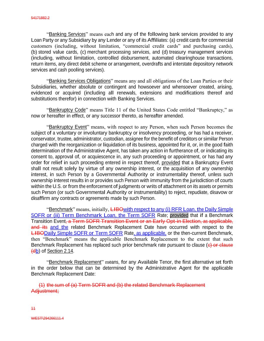 54171882.2 11 WEST\294266111.4 “Banking Services” means each and any of the following bank services provided to any Loan Party or any Subsidiary by any Lender or any of its Affiliates: (a) credit cards for commercial customers (including, without limitation, “commercial credit cards” and purchasing cards), (b) stored value cards, (c) merchant processing services, and (d) treasury management services (including, without limitation, controlled disbursement, automated clearinghouse transactions, return items, any direct debit scheme or arrangement, overdrafts and interstate depository network services and cash pooling services). “Banking Services Obligations” means any and all obligations of the Loan Parties or their Subsidiaries, whether absolute or contingent and howsoever and whensoever created, arising, evidenced or acquired (including all renewals, extensions and modifications thereof and substitutions therefor) in connection with Banking Services. “Bankruptcy Code” means Title 11 of the United States Code entitled “Bankruptcy,” as now or hereafter in effect, or any successor thereto, as hereafter amended. “Bankruptcy Event” means, with respect to any Person, when such Person becomes the subject of a voluntary or involuntary bankruptcy or insolvency proceeding, or has had a receiver, conservator, trustee, administrator, custodian, assignee for the benefit of creditors or similar Person charged with the reorganization or liquidation of its business, appointed for it, or, in the good faith determination of the Administrative Agent, has taken any action in furtherance of, or indicating its consent to, approval of, or acquiescence in, any such proceeding or appointment, or has had any order for relief in such proceeding entered in respect thereof, provided that a Bankruptcy Event shall not result solely by virtue of any ownership interest, or the acquisition of any ownership interest, in such Person by a Governmental Authority or instrumentality thereof, unless such ownership interest results in or provides such Person with immunity from the jurisdiction of courts within the U.S. or from the enforcement of judgments or writs of attachment on its assets or permits such Person (or such Governmental Authority or instrumentality) to reject, repudiate, disavow or disaffirm any contracts or agreements made by such Person. “Benchmark” means, initially, LIBOwith respect to any (i) RFR Loan, the Daily Simple SOFR or (ii) Term Benchmark Loan, the Term SOFR Rate; provided that if a Benchmark Transition Event, a Term SOFR Transition Event or an Early Opt-in Election, as applicable, and its and the related Benchmark Replacement Date have occurred with respect to the LIBODaily Simple SOFR or Term SOFR Rate, as applicable, or the then-current Benchmark, then “Benchmark” means the applicable Benchmark Replacement to the extent that such Benchmark Replacement has replaced such prior benchmark rate pursuant to clause (c) or clause (db) of Section 2.14. “Benchmark Replacement” means, for any Available Tenor, the first alternative set forth in the order below that can be determined by the Administrative Agent for the applicable Benchmark Replacement Date: (1) the sum of (a) Term SOFR and (b) the related Benchmark Replacement Adjustment;