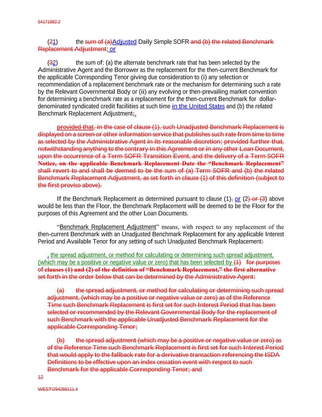 54171882.2 12 WEST\294266111.4 (21) the sum of (a)Adjusted Daily Simple SOFR and (b) the related Benchmark Replacement Adjustment; or (32) the sum of: (a) the alternate benchmark rate that has been selected by the Administrative Agent and the Borrower as the replacement for the then-current Benchmark for the applicable Corresponding Tenor giving due consideration to (i) any selection or recommendation of a replacement benchmark rate or the mechanism for determining such a rate by the Relevant Governmental Body or (ii) any evolving or then-prevailing market convention for determining a benchmark rate as a replacement for the then-current Benchmark for dollar- denominated syndicated credit facilities at such time in the United States and (b) the related Benchmark Replacement Adjustment;. provided that, in the case of clause (1), such Unadjusted Benchmark Replacement is displayed on a screen or other information service that publishes such rate from time to time as selected by the Administrative Agent in its reasonable discretion; provided further that, notwithstanding anything to the contrary in this Agreement or in any other Loan Document, upon the occurrence of a Term SOFR Transition Event, and the delivery of a Term SOFR Notice, on the applicable Benchmark Replacement Date the “Benchmark Replacement” shall revert to and shall be deemed to be the sum of (a) Term SOFR and (b) the related Benchmark Replacement Adjustment, as set forth in clause (1) of this definition (subject to the first proviso above). If the Benchmark Replacement as determined pursuant to clause (1), or (2) or (3) above would be less than the Floor, the Benchmark Replacement will be deemed to be the Floor for the purposes of this Agreement and the other Loan Documents. “Benchmark Replacement Adjustment” means, with respect to any replacement of the then-current Benchmark with an Unadjusted Benchmark Replacement for any applicable Interest Period and Available Tenor for any setting of such Unadjusted Benchmark Replacement: , the spread adjustment, or method for calculating or determining such spread adjustment, (which may be a positive or negative value or zero) that has been selected by (1) for purposes of clauses (1) and (2) of the definition of “Benchmark Replacement,” the first alternative set forth in the order below that can be determined by the Administrative Agent: (a) the spread adjustment, or method for calculating or determining such spread adjustment, (which may be a positive or negative value or zero) as of the Reference Time such Benchmark Replacement is first set for such Interest Period that has been selected or recommended by the Relevant Governmental Body for the replacement of such Benchmark with the applicable Unadjusted Benchmark Replacement for the applicable Corresponding Tenor; (b) the spread adjustment (which may be a positive or negative value or zero) as of the Reference Time such Benchmark Replacement is first set for such Interest Period that would apply to the fallback rate for a derivative transaction referencing the ISDA Definitions to be effective upon an index cessation event with respect to such Benchmark for the applicable Corresponding Tenor; and