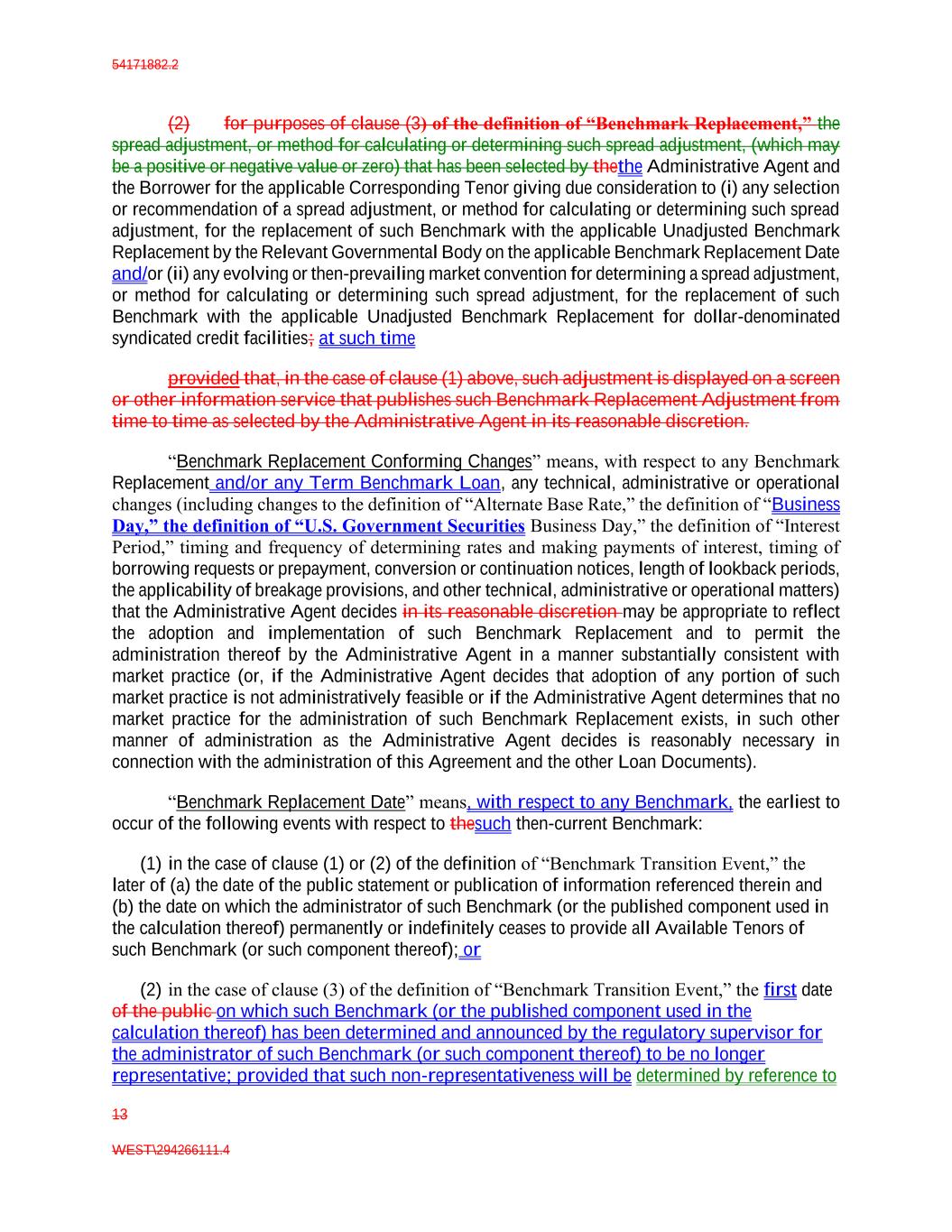54171882.2 13 WEST\294266111.4 (2) for purposes of clause (3) of the definition of “Benchmark Replacement,” the spread adjustment, or method for calculating or determining such spread adjustment, (which may be a positive or negative value or zero) that has been selected by thethe Administrative Agent and the Borrower for the applicable Corresponding Tenor giving due consideration to (i) any selection or recommendation of a spread adjustment, or method for calculating or determining such spread adjustment, for the replacement of such Benchmark with the applicable Unadjusted Benchmark Replacement by the Relevant Governmental Body on the applicable Benchmark Replacement Date and/or (ii) any evolving or then-prevailing market convention for determining a spread adjustment, or method for calculating or determining such spread adjustment, for the replacement of such Benchmark with the applicable Unadjusted Benchmark Replacement for dollar-denominated syndicated credit facilities; at such time provided that, in the case of clause (1) above, such adjustment is displayed on a screen or other information service that publishes such Benchmark Replacement Adjustment from time to time as selected by the Administrative Agent in its reasonable discretion. “Benchmark Replacement Conforming Changes” means, with respect to any Benchmark Replacement and/or any Term Benchmark Loan, any technical, administrative or operational changes (including changes to the definition of “Alternate Base Rate,” the definition of “Business Day,” the definition of “U.S. Government Securities Business Day,” the definition of “Interest Period,” timing and frequency of determining rates and making payments of interest, timing of borrowing requests or prepayment, conversion or continuation notices, length of lookback periods, the applicability of breakage provisions, and other technical, administrative or operational matters) that the Administrative Agent decides in its reasonable discretion may be appropriate to reflect the adoption and implementation of such Benchmark Replacement and to permit the administration thereof by the Administrative Agent in a manner substantially consistent with market practice (or, if the Administrative Agent decides that adoption of any portion of such market practice is not administratively feasible or if the Administrative Agent determines that no market practice for the administration of such Benchmark Replacement exists, in such other manner of administration as the Administrative Agent decides is reasonably necessary in connection with the administration of this Agreement and the other Loan Documents). “Benchmark Replacement Date” means, with respect to any Benchmark, the earliest to occur of the following events with respect to thesuch then-current Benchmark: (1) in the case of clause (1) or (2) of the definition of “Benchmark Transition Event,” the later of (a) the date of the public statement or publication of information referenced therein and (b) the date on which the administrator of such Benchmark (or the published component used in the calculation thereof) permanently or indefinitely ceases to provide all Available Tenors of such Benchmark (or such component thereof); or (2) in the case of clause (3) of the definition of “Benchmark Transition Event,” the first date of the public on which such Benchmark (or the published component used in the calculation thereof) has been determined and announced by the regulatory supervisor for the administrator of such Benchmark (or such component thereof) to be no longer representative; provided that such non-representativeness will be determined by reference to
