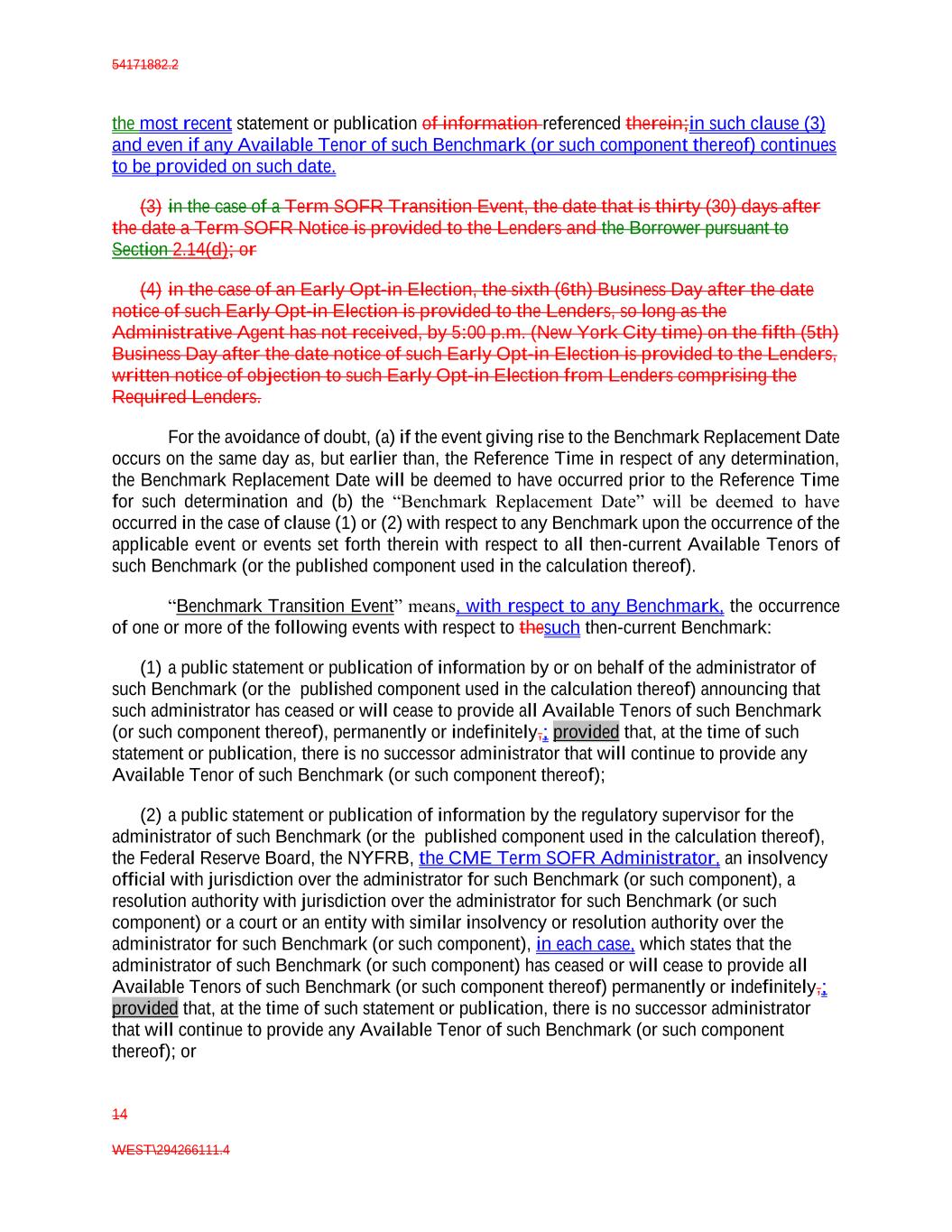 54171882.2 14 WEST\294266111.4 the most recent statement or publication of information referenced therein;in such clause (3) and even if any Available Tenor of such Benchmark (or such component thereof) continues to be provided on such date. (3) in the case of a Term SOFR Transition Event, the date that is thirty (30) days after the date a Term SOFR Notice is provided to the Lenders and the Borrower pursuant to Section 2.14(d); or (4) in the case of an Early Opt-in Election, the sixth (6th) Business Day after the date notice of such Early Opt-in Election is provided to the Lenders, so long as the Administrative Agent has not received, by 5:00 p.m. (New York City time) on the fifth (5th) Business Day after the date notice of such Early Opt-in Election is provided to the Lenders, written notice of objection to such Early Opt-in Election from Lenders comprising the Required Lenders. For the avoidance of doubt, (a) if the event giving rise to the Benchmark Replacement Date occurs on the same day as, but earlier than, the Reference Time in respect of any determination, the Benchmark Replacement Date will be deemed to have occurred prior to the Reference Time for such determination and (b) the “Benchmark Replacement Date” will be deemed to have occurred in the case of clause (1) or (2) with respect to any Benchmark upon the occurrence of the applicable event or events set forth therein with respect to all then-current Available Tenors of such Benchmark (or the published component used in the calculation thereof). “Benchmark Transition Event” means, with respect to any Benchmark, the occurrence of one or more of the following events with respect to thesuch then-current Benchmark: (1) a public statement or publication of information by or on behalf of the administrator of such Benchmark (or the published component used in the calculation thereof) announcing that such administrator has ceased or will cease to provide all Available Tenors of such Benchmark (or such component thereof), permanently or indefinitely,; provided that, at the time of such statement or publication, there is no successor administrator that will continue to provide any Available Tenor of such Benchmark (or such component thereof); (2) a public statement or publication of information by the regulatory supervisor for the administrator of such Benchmark (or the published component used in the calculation thereof), the Federal Reserve Board, the NYFRB, the CME Term SOFR Administrator, an insolvency official with jurisdiction over the administrator for such Benchmark (or such component), a resolution authority with jurisdiction over the administrator for such Benchmark (or such component) or a court or an entity with similar insolvency or resolution authority over the administrator for such Benchmark (or such component), in each case, which states that the administrator of such Benchmark (or such component) has ceased or will cease to provide all Available Tenors of such Benchmark (or such component thereof) permanently or indefinitely,; provided that, at the time of such statement or publication, there is no successor administrator that will continue to provide any Available Tenor of such Benchmark (or such component thereof); or