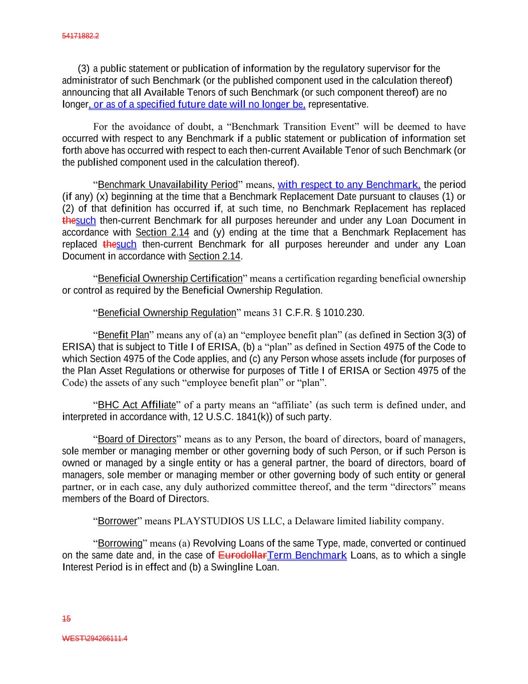 54171882.2 15 WEST\294266111.4 (3) a public statement or publication of information by the regulatory supervisor for the administrator of such Benchmark (or the published component used in the calculation thereof) announcing that all Available Tenors of such Benchmark (or such component thereof) are no longer, or as of a specified future date will no longer be, representative. For the avoidance of doubt, a “Benchmark Transition Event” will be deemed to have occurred with respect to any Benchmark if a public statement or publication of information set forth above has occurred with respect to each then-current Available Tenor of such Benchmark (or the published component used in the calculation thereof). “Benchmark Unavailability Period” means, with respect to any Benchmark, the period (if any) (x) beginning at the time that a Benchmark Replacement Date pursuant to clauses (1) or (2) of that definition has occurred if, at such time, no Benchmark Replacement has replaced thesuch then-current Benchmark for all purposes hereunder and under any Loan Document in accordance with Section 2.14 and (y) ending at the time that a Benchmark Replacement has replaced thesuch then-current Benchmark for all purposes hereunder and under any Loan Document in accordance with Section 2.14. “Beneficial Ownership Certification” means a certification regarding beneficial ownership or control as required by the Beneficial Ownership Regulation. “Beneficial Ownership Regulation” means 31 C.F.R. § 1010.230. “Benefit Plan” means any of (a) an “employee benefit plan” (as defined in Section 3(3) of ERISA) that is subject to Title I of ERISA, (b) a “plan” as defined in Section 4975 of the Code to which Section 4975 of the Code applies, and (c) any Person whose assets include (for purposes of the Plan Asset Regulations or otherwise for purposes of Title I of ERISA or Section 4975 of the Code) the assets of any such “employee benefit plan” or “plan”. “BHC Act Affiliate” of a party means an “affiliate’ (as such term is defined under, and interpreted in accordance with, 12 U.S.C. 1841(k)) of such party. “Board of Directors” means as to any Person, the board of directors, board of managers, sole member or managing member or other governing body of such Person, or if such Person is owned or managed by a single entity or has a general partner, the board of directors, board of managers, sole member or managing member or other governing body of such entity or general partner, or in each case, any duly authorized committee thereof, and the term “directors” means members of the Board of Directors. “Borrower” means PLAYSTUDIOS US LLC, a Delaware limited liability company. “Borrowing” means (a) Revolving Loans of the same Type, made, converted or continued on the same date and, in the case of EurodollarTerm Benchmark Loans, as to which a single Interest Period is in effect and (b) a Swingline Loan.