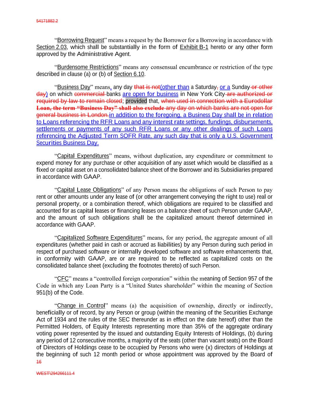 54171882.2 16 WEST\294266111.4 “Borrowing Request” means a request by the Borrower for a Borrowing in accordance with Section 2.03, which shall be substantially in the form of Exhibit B-1 hereto or any other form approved by the Administrative Agent. “Burdensome Restrictions” means any consensual encumbrance or restriction of the type described in clause (a) or (b) of Section 6.10. “Business Day” means, any day that is not(other than a Saturday, or a Sunday or other day) on which commercial banks are open for business in New York City are authorized or required by law to remain closed; provided that, when used in connection with a Eurodollar Loan, the term “Business Day” shall also exclude any day on which banks are not open for general business in London.in addition to the foregoing, a Business Day shall be in relation to Loans referencing the RFR Loans and any interest rate settings, fundings, disbursements, settlements or payments of any such RFR Loans or any other dealings of such Loans referencing the Adjusted Term SOFR Rate, any such day that is only a U.S. Government Securities Business Day. “Capital Expenditures” means, without duplication, any expenditure or commitment to expend money for any purchase or other acquisition of any asset which would be classified as a fixed or capital asset on a consolidated balance sheet of the Borrower and its Subsidiaries prepared in accordance with GAAP. “Capital Lease Obligations” of any Person means the obligations of such Person to pay rent or other amounts under any lease of (or other arrangement conveying the right to use) real or personal property, or a combination thereof, which obligations are required to be classified and accounted for as capital leases or financing leases on a balance sheet of such Person under GAAP, and the amount of such obligations shall be the capitalized amount thereof determined in accordance with GAAP. “Capitalized Software Expenditures” means, for any period, the aggregate amount of all expenditures (whether paid in cash or accrued as liabilities) by any Person during such period in respect of purchased software or internally developed software and software enhancements that, in conformity with GAAP, are or are required to be reflected as capitalized costs on the consolidated balance sheet (excluding the footnotes thereto) of such Person. “CFC” means a “controlled foreign corporation” within the meaning of Section 957 of the Code in which any Loan Party is a “United States shareholder” within the meaning of Section 951(b) of the Code. “Change in Control” means (a) the acquisition of ownership, directly or indirectly, beneficially or of record, by any Person or group (within the meaning of the Securities Exchange Act of 1934 and the rules of the SEC thereunder as in effect on the date hereof) other than the Permitted Holders, of Equity Interests representing more than 35% of the aggregate ordinary voting power represented by the issued and outstanding Equity Interests of Holdings, (b) during any period of 12 consecutive months, a majority of the seats (other than vacant seats) on the Board of Directors of Holdings cease to be occupied by Persons who were (x) directors of Holdings at the beginning of such 12 month period or whose appointment was approved by the Board of
