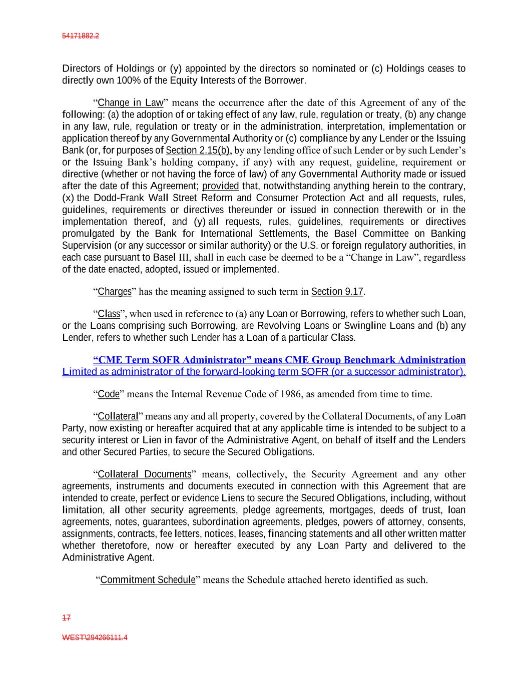 54171882.2 17 WEST\294266111.4 Directors of Holdings or (y) appointed by the directors so nominated or (c) Holdings ceases to directly own 100% of the Equity Interests of the Borrower. “Change in Law” means the occurrence after the date of this Agreement of any of the following: (a) the adoption of or taking effect of any law, rule, regulation or treaty, (b) any change in any law, rule, regulation or treaty or in the administration, interpretation, implementation or application thereof by any Governmental Authority or (c) compliance by any Lender or the Issuing Bank (or, for purposes of Section 2.15(b), by any lending office of such Lender or by such Lender’s or the Issuing Bank’s holding company, if any) with any request, guideline, requirement or directive (whether or not having the force of law) of any Governmental Authority made or issued after the date of this Agreement; provided that, notwithstanding anything herein to the contrary, (x) the Dodd-Frank Wall Street Reform and Consumer Protection Act and all requests, rules, guidelines, requirements or directives thereunder or issued in connection therewith or in the implementation thereof, and (y) all requests, rules, guidelines, requirements or directives promulgated by the Bank for International Settlements, the Basel Committee on Banking Supervision (or any successor or similar authority) or the U.S. or foreign regulatory authorities, in each case pursuant to Basel III, shall in each case be deemed to be a “Change in Law”, regardless of the date enacted, adopted, issued or implemented. “Charges” has the meaning assigned to such term in Section 9.17. “Class”, when used in reference to (a) any Loan or Borrowing, refers to whether such Loan, or the Loans comprising such Borrowing, are Revolving Loans or Swingline Loans and (b) any Lender, refers to whether such Lender has a Loan of a particular Class. “CME Term SOFR Administrator” means CME Group Benchmark Administration Limited as administrator of the forward-looking term SOFR (or a successor administrator). “Code” means the Internal Revenue Code of 1986, as amended from time to time. “Collateral” means any and all property, covered by the Collateral Documents, of any Loan Party, now existing or hereafter acquired that at any applicable time is intended to be subject to a security interest or Lien in favor of the Administrative Agent, on behalf of itself and the Lenders and other Secured Parties, to secure the Secured Obligations. “Collateral Documents” means, collectively, the Security Agreement and any other agreements, instruments and documents executed in connection with this Agreement that are intended to create, perfect or evidence Liens to secure the Secured Obligations, including, without limitation, all other security agreements, pledge agreements, mortgages, deeds of trust, loan agreements, notes, guarantees, subordination agreements, pledges, powers of attorney, consents, assignments, contracts, fee letters, notices, leases, financing statements and all other written matter whether theretofore, now or hereafter executed by any Loan Party and delivered to the Administrative Agent. “Commitment Schedule” means the Schedule attached hereto identified as such.