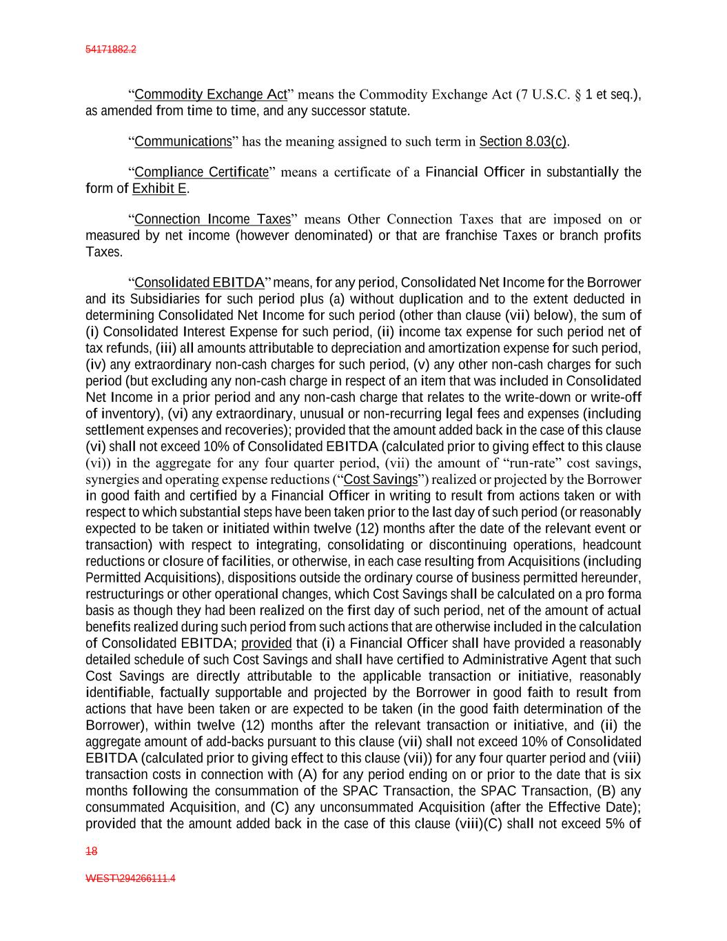 54171882.2 18 WEST\294266111.4 “Commodity Exchange Act” means the Commodity Exchange Act (7 U.S.C. § 1 et seq.), as amended from time to time, and any successor statute. “Communications” has the meaning assigned to such term in Section 8.03(c). “Compliance Certificate” means a certificate of a Financial Officer in substantially the form of Exhibit E. “Connection Income Taxes” means Other Connection Taxes that are imposed on or measured by net income (however denominated) or that are franchise Taxes or branch profits Taxes. “Consolidated EBITDA” means, for any period, Consolidated Net Income for the Borrower and its Subsidiaries for such period plus (a) without duplication and to the extent deducted in determining Consolidated Net Income for such period (other than clause (vii) below), the sum of (i) Consolidated Interest Expense for such period, (ii) income tax expense for such period net of tax refunds, (iii) all amounts attributable to depreciation and amortization expense for such period, (iv) any extraordinary non-cash charges for such period, (v) any other non-cash charges for such period (but excluding any non-cash charge in respect of an item that was included in Consolidated Net Income in a prior period and any non-cash charge that relates to the write-down or write-off of inventory), (vi) any extraordinary, unusual or non-recurring legal fees and expenses (including settlement expenses and recoveries); provided that the amount added back in the case of this clause (vi) shall not exceed 10% of Consolidated EBITDA (calculated prior to giving effect to this clause (vi)) in the aggregate for any four quarter period, (vii) the amount of “run-rate” cost savings, synergies and operating expense reductions (“Cost Savings”) realized or projected by the Borrower in good faith and certified by a Financial Officer in writing to result from actions taken or with respect to which substantial steps have been taken prior to the last day of such period (or reasonably expected to be taken or initiated within twelve (12) months after the date of the relevant event or transaction) with respect to integrating, consolidating or discontinuing operations, headcount reductions or closure of facilities, or otherwise, in each case resulting from Acquisitions (including Permitted Acquisitions), dispositions outside the ordinary course of business permitted hereunder, restructurings or other operational changes, which Cost Savings shall be calculated on a pro forma basis as though they had been realized on the first day of such period, net of the amount of actual benefits realized during such period from such actions that are otherwise included in the calculation of Consolidated EBITDA; provided that (i) a Financial Officer shall have provided a reasonably detailed schedule of such Cost Savings and shall have certified to Administrative Agent that such Cost Savings are directly attributable to the applicable transaction or initiative, reasonably identifiable, factually supportable and projected by the Borrower in good faith to result from actions that have been taken or are expected to be taken (in the good faith determination of the Borrower), within twelve (12) months after the relevant transaction or initiative, and (ii) the aggregate amount of add-backs pursuant to this clause (vii) shall not exceed 10% of Consolidated EBITDA (calculated prior to giving effect to this clause (vii)) for any four quarter period and (viii) transaction costs in connection with (A) for any period ending on or prior to the date that is six months following the consummation of the SPAC Transaction, the SPAC Transaction, (B) any consummated Acquisition, and (C) any unconsummated Acquisition (after the Effective Date); provided that the amount added back in the case of this clause (viii)(C) shall not exceed 5% of
