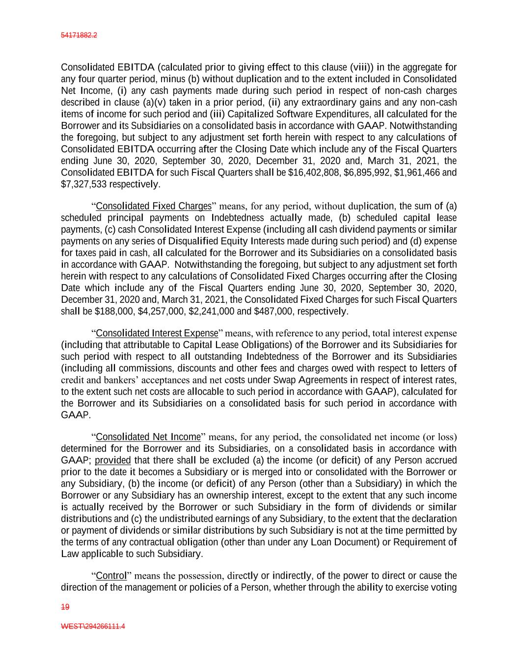 54171882.2 19 WEST\294266111.4 Consolidated EBITDA (calculated prior to giving effect to this clause (viii)) in the aggregate for any four quarter period, minus (b) without duplication and to the extent included in Consolidated Net Income, (i) any cash payments made during such period in respect of non-cash charges described in clause (a)(v) taken in a prior period, (ii) any extraordinary gains and any non-cash items of income for such period and (iii) Capitalized Software Expenditures, all calculated for the Borrower and its Subsidiaries on a consolidated basis in accordance with GAAP. Notwithstanding the foregoing, but subject to any adjustment set forth herein with respect to any calculations of Consolidated EBITDA occurring after the Closing Date which include any of the Fiscal Quarters ending June 30, 2020, September 30, 2020, December 31, 2020 and, March 31, 2021, the Consolidated EBITDA for such Fiscal Quarters shall be $16,402,808, $6,895,992, $1,961,466 and $7,327,533 respectively. “Consolidated Fixed Charges” means, for any period, without duplication, the sum of (a) scheduled principal payments on Indebtedness actually made, (b) scheduled capital lease payments, (c) cash Consolidated Interest Expense (including all cash dividend payments or similar payments on any series of Disqualified Equity Interests made during such period) and (d) expense for taxes paid in cash, all calculated for the Borrower and its Subsidiaries on a consolidated basis in accordance with GAAP. Notwithstanding the foregoing, but subject to any adjustment set forth herein with respect to any calculations of Consolidated Fixed Charges occurring after the Closing Date which include any of the Fiscal Quarters ending June 30, 2020, September 30, 2020, December 31, 2020 and, March 31, 2021, the Consolidated Fixed Charges for such Fiscal Quarters shall be $188,000, $4,257,000, $2,241,000 and $487,000, respectively. “Consolidated Interest Expense” means, with reference to any period, total interest expense (including that attributable to Capital Lease Obligations) of the Borrower and its Subsidiaries for such period with respect to all outstanding Indebtedness of the Borrower and its Subsidiaries (including all commissions, discounts and other fees and charges owed with respect to letters of credit and bankers’ acceptances and net costs under Swap Agreements in respect of interest rates, to the extent such net costs are allocable to such period in accordance with GAAP), calculated for the Borrower and its Subsidiaries on a consolidated basis for such period in accordance with GAAP. “Consolidated Net Income” means, for any period, the consolidated net income (or loss) determined for the Borrower and its Subsidiaries, on a consolidated basis in accordance with GAAP; provided that there shall be excluded (a) the income (or deficit) of any Person accrued prior to the date it becomes a Subsidiary or is merged into or consolidated with the Borrower or any Subsidiary, (b) the income (or deficit) of any Person (other than a Subsidiary) in which the Borrower or any Subsidiary has an ownership interest, except to the extent that any such income is actually received by the Borrower or such Subsidiary in the form of dividends or similar distributions and (c) the undistributed earnings of any Subsidiary, to the extent that the declaration or payment of dividends or similar distributions by such Subsidiary is not at the time permitted by the terms of any contractual obligation (other than under any Loan Document) or Requirement of Law applicable to such Subsidiary. “Control” means the possession, directly or indirectly, of the power to direct or cause the direction of the management or policies of a Person, whether through the ability to exercise voting