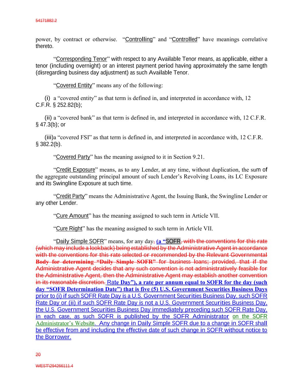 54171882.2 20 WEST\294266111.4 power, by contract or otherwise. “Controlling” and “Controlled” have meanings correlative thereto. “Corresponding Tenor” with respect to any Available Tenor means, as applicable, either a tenor (including overnight) or an interest payment period having approximately the same length (disregarding business day adjustment) as such Available Tenor. “Covered Entity” means any of the following: (i) a “covered entity” as that term is defined in, and interpreted in accordance with, 12 C.F.R. § 252.82(b); (ii) a “covered bank” as that term is defined in, and interpreted in accordance with, 12 C.F.R. § 47.3(b); or (iii)a “covered FSI” as that term is defined in, and interpreted in accordance with, 12 C.F.R. § 382.2(b). “Covered Party” has the meaning assigned to it in Section 9.21. “Credit Exposure” means, as to any Lender, at any time, without duplication, the sum of the aggregate outstanding principal amount of such Lender’s Revolving Loans, its LC Exposure and its Swingline Exposure at such time. “Credit Party” means the Administrative Agent, the Issuing Bank, the Swingline Lender or any other Lender. “Cure Amount” has the meaning assigned to such term in Article VII. “Cure Right” has the meaning assigned to such term in Article VII. “Daily Simple SOFR” means, for any day, (a “SOFR, with the conventions for this rate (which may include a lookback) being established by the Administrative Agent in accordance with the conventions for this rate selected or recommended by the Relevant Governmental Body for determining “Daily Simple SOFR” for business loans; provided, that if the Administrative Agent decides that any such convention is not administratively feasible for the Administrative Agent, then the Administrative Agent may establish another convention in its reasonable discretion. Rate Day”), a rate per annum equal to SOFR for the day (such day “SOFR Determination Date”) that is five (5) U.S. Government Securities Business Days prior to (i) if such SOFR Rate Day is a U.S. Government Securities Business Day, such SOFR Rate Day or (ii) if such SOFR Rate Day is not a U.S. Government Securities Business Day, the U.S. Government Securities Business Day immediately preceding such SOFR Rate Day, in each case, as such SOFR is published by the SOFR Administrator on the SOFR Administrator’s Website. Any change in Daily Simple SOFR due to a change in SOFR shall be effective from and including the effective date of such change in SOFR without notice to the Borrower.