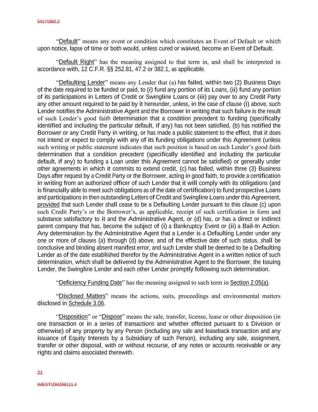 54171882.2 21 WEST\294266111.4 “Default” means any event or condition which constitutes an Event of Default or which upon notice, lapse of time or both would, unless cured or waived, become an Event of Default. “Default Right” has the meaning assigned to that term in, and shall be interpreted in accordance with, 12 C.F.R. §§ 252.81, 47.2 or 382.1, as applicable. “Defaulting Lender” means any Lender that (a) has failed, within two (2) Business Days of the date required to be funded or paid, to (i) fund any portion of its Loans, (ii) fund any portion of its participations in Letters of Credit or Swingline Loans or (iii) pay over to any Credit Party any other amount required to be paid by it hereunder, unless, in the case of clause (i) above, such Lender notifies the Administrative Agent and the Borrower in writing that such failure is the result of such Lender’s good faith determination that a condition precedent to funding (specifically identified and including the particular default, if any) has not been satisfied, (b) has notified the Borrower or any Credit Party in writing, or has made a public statement to the effect, that it does not intend or expect to comply with any of its funding obligations under this Agreement (unless such writing or public statement indicates that such position is based on such Lender’s good faith determination that a condition precedent (specifically identified and including the particular default, if any) to funding a Loan under this Agreement cannot be satisfied) or generally under other agreements in which it commits to extend credit, (c) has failed, within three (3) Business Days after request by a Credit Party or the Borrower, acting in good faith, to provide a certification in writing from an authorized officer of such Lender that it will comply with its obligations (and is financially able to meet such obligations as of the date of certification) to fund prospective Loans and participations in then outstanding Letters of Credit and Swingline Loans under this Agreement, provided that such Lender shall cease to be a Defaulting Lender pursuant to this clause (c) upon such Credit Party’s or the Borrower’s, as applicable, receipt of such certification in form and substance satisfactory to it and the Administrative Agent, or (d) has, or has a direct or indirect parent company that has, become the subject of (i) a Bankruptcy Event or (ii) a Bail-In Action. Any determination by the Administrative Agent that a Lender is a Defaulting Lender under any one or more of clauses (a) through (d) above, and of the effective date of such status, shall be conclusive and binding absent manifest error, and such Lender shall be deemed to be a Defaulting Lender as of the date established therefor by the Administrative Agent in a written notice of such determination, which shall be delivered by the Administrative Agent to the Borrower, the Issuing Lender, the Swingline Lender and each other Lender promptly following such determination. “Deficiency Funding Date” has the meaning assigned to such term in Section 2.05(a). “Disclosed Matters” means the actions, suits, proceedings and environmental matters disclosed in Schedule 3.06. “Disposition” or “Dispose” means the sale, transfer, license, lease or other disposition (in one transaction or in a series of transactions and whether effected pursuant to a Division or otherwise) of any property by any Person (including any sale and leaseback transaction and any issuance of Equity Interests by a Subsidiary of such Person), including any sale, assignment, transfer or other disposal, with or without recourse, of any notes or accounts receivable or any rights and claims associated therewith.