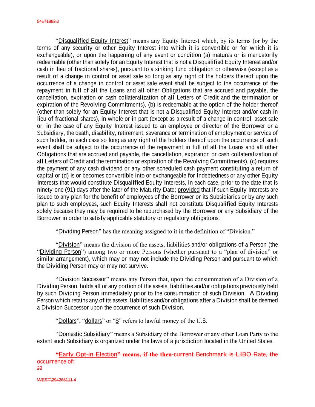 54171882.2 22 WEST\294266111.4 “Disqualified Equity Interest” means any Equity Interest which, by its terms (or by the terms of any security or other Equity Interest into which it is convertible or for which it is exchangeable), or upon the happening of any event or condition (a) matures or is mandatorily redeemable (other than solely for an Equity Interest that is not a Disqualified Equity Interest and/or cash in lieu of fractional shares), pursuant to a sinking fund obligation or otherwise (except as a result of a change in control or asset sale so long as any right of the holders thereof upon the occurrence of a change in control or asset sale event shall be subject to the occurrence of the repayment in full of all the Loans and all other Obligations that are accrued and payable, the cancellation, expiration or cash collateralization of all Letters of Credit and the termination or expiration of the Revolving Commitments), (b) is redeemable at the option of the holder thereof (other than solely for an Equity Interest that is not a Disqualified Equity Interest and/or cash in lieu of fractional shares), in whole or in part (except as a result of a change in control, asset sale or, in the case of any Equity Interest issued to an employee or director of the Borrower or a Subsidiary, the death, disability, retirement, severance or termination of employment or service of such holder, in each case so long as any right of the holders thereof upon the occurrence of such event shall be subject to the occurrence of the repayment in full of all the Loans and all other Obligations that are accrued and payable, the cancellation, expiration or cash collateralization of all Letters of Credit and the termination or expiration of the Revolving Commitments), (c) requires the payment of any cash dividend or any other scheduled cash payment constituting a return of capital or (d) is or becomes convertible into or exchangeable for Indebtedness or any other Equity Interests that would constitute Disqualified Equity Interests, in each case, prior to the date that is ninety-one (91) days after the later of the Maturity Date; provided that if such Equity Interests are issued to any plan for the benefit of employees of the Borrower or its Subsidiaries or by any such plan to such employees, such Equity Interests shall not constitute Disqualified Equity Interests solely because they may be required to be repurchased by the Borrower or any Subsidiary of the Borrower in order to satisfy applicable statutory or regulatory obligations. “Dividing Person” has the meaning assigned to it in the definition of “Division.” “Division” means the division of the assets, liabilities and/or obligations of a Person (the “Dividing Person”) among two or more Persons (whether pursuant to a “plan of division” or similar arrangement), which may or may not include the Dividing Person and pursuant to which the Dividing Person may or may not survive. “Division Successor” means any Person that, upon the consummation of a Division of a Dividing Person, holds all or any portion of the assets, liabilities and/or obligations previously held by such Dividing Person immediately prior to the consummation of such Division. A Dividing Person which retains any of its assets, liabilities and/or obligations after a Division shall be deemed a Division Successor upon the occurrence of such Division. “Dollars”, “dollars” or “$” refers to lawful money of the U.S. “Domestic Subsidiary” means a Subsidiary of the Borrower or any other Loan Party to the extent such Subsidiary is organized under the laws of a jurisdiction located in the United States. “Early Opt-in Election” means, if the then-current Benchmark is LIBO Rate, the occurrence of: