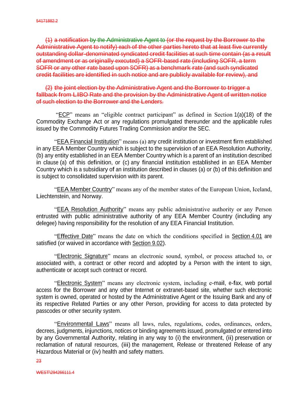 54171882.2 23 WEST\294266111.4 (1) a notification by the Administrative Agent to (or the request by the Borrower to the Administrative Agent to notify) each of the other parties hereto that at least five currently outstanding dollar-denominated syndicated credit facilities at such time contain (as a result of amendment or as originally executed) a SOFR-based rate (including SOFR, a term SOFR or any other rate based upon SOFR) as a benchmark rate (and such syndicated credit facilities are identified in such notice and are publicly available for review), and (2) the joint election by the Administrative Agent and the Borrower to trigger a fallback from LIBO Rate and the provision by the Administrative Agent of written notice of such election to the Borrower and the Lenders. “ECP” means an “eligible contract participant” as defined in Section 1(a)(18) of the Commodity Exchange Act or any regulations promulgated thereunder and the applicable rules issued by the Commodity Futures Trading Commission and/or the SEC. “EEA Financial Institution” means (a) any credit institution or investment firm established in any EEA Member Country which is subject to the supervision of an EEA Resolution Authority, (b) any entity established in an EEA Member Country which is a parent of an institution described in clause (a) of this definition, or (c) any financial institution established in an EEA Member Country which is a subsidiary of an institution described in clauses (a) or (b) of this definition and is subject to consolidated supervision with its parent. “EEA Member Country” means any of the member states of the European Union, Iceland, Liechtenstein, and Norway. “EEA Resolution Authority” means any public administrative authority or any Person entrusted with public administrative authority of any EEA Member Country (including any delegee) having responsibility for the resolution of any EEA Financial Institution. “Effective Date” means the date on which the conditions specified in Section 4.01 are satisfied (or waived in accordance with Section 9.02). “Electronic Signature” means an electronic sound, symbol, or process attached to, or associated with, a contract or other record and adopted by a Person with the intent to sign, authenticate or accept such contract or record. “Electronic System” means any electronic system, including e-mail, e-fax, web portal access for the Borrower and any other Internet or extranet-based site, whether such electronic system is owned, operated or hosted by the Administrative Agent or the Issuing Bank and any of its respective Related Parties or any other Person, providing for access to data protected by passcodes or other security system. “Environmental Laws” means all laws, rules, regulations, codes, ordinances, orders, decrees, judgments, injunctions, notices or binding agreements issued, promulgated or entered into by any Governmental Authority, relating in any way to (i) the environment, (ii) preservation or reclamation of natural resources, (iii) the management, Release or threatened Release of any Hazardous Material or (iv) health and safety matters.
