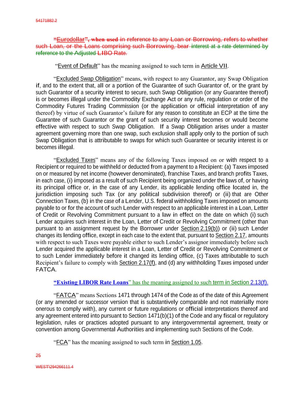 54171882.2 25 WEST\294266111.4 “Eurodollar”, when used in reference to any Loan or Borrowing, refers to whether such Loan, or the Loans comprising such Borrowing, bear interest at a rate determined by reference to the Adjusted LIBO Rate. “Event of Default” has the meaning assigned to such term in Article VII. “Excluded Swap Obligation” means, with respect to any Guarantor, any Swap Obligation if, and to the extent that, all or a portion of the Guarantee of such Guarantor of, or the grant by such Guarantor of a security interest to secure, such Swap Obligation (or any Guarantee thereof) is or becomes illegal under the Commodity Exchange Act or any rule, regulation or order of the Commodity Futures Trading Commission (or the application or official interpretation of any thereof) by virtue of such Guarantor’s failure for any reason to constitute an ECP at the time the Guarantee of such Guarantor or the grant of such security interest becomes or would become effective with respect to such Swap Obligation. If a Swap Obligation arises under a master agreement governing more than one swap, such exclusion shall apply only to the portion of such Swap Obligation that is attributable to swaps for which such Guarantee or security interest is or becomes illegal. “Excluded Taxes” means any of the following Taxes imposed on or with respect to a Recipient or required to be withheld or deducted from a payment to a Recipient: (a) Taxes imposed on or measured by net income (however denominated), franchise Taxes, and branch profits Taxes, in each case, (i) imposed as a result of such Recipient being organized under the laws of, or having its principal office or, in the case of any Lender, its applicable lending office located in, the jurisdiction imposing such Tax (or any political subdivision thereof) or (ii) that are Other Connection Taxes, (b) in the case of a Lender, U.S. federal withholding Taxes imposed on amounts payable to or for the account of such Lender with respect to an applicable interest in a Loan, Letter of Credit or Revolving Commitment pursuant to a law in effect on the date on which (i) such Lender acquires such interest in the Loan, Letter of Credit or Revolving Commitment (other than pursuant to an assignment request by the Borrower under Section 2.19(b)) or (ii) such Lender changes its lending office, except in each case to the extent that, pursuant to Section 2.17, amounts with respect to such Taxes were payable either to such Lender’s assignor immediately before such Lender acquired the applicable interest in a Loan, Letter of Credit or Revolving Commitment or to such Lender immediately before it changed its lending office, (c) Taxes attributable to such Recipient’s failure to comply with Section 2.17(f), and (d) any withholding Taxes imposed under FATCA. “Existing LIBOR Rate Loans” has the meaning assigned to such term in Section 2.13(f). “FATCA” means Sections 1471 through 1474 of the Code as of the date of this Agreement (or any amended or successor version that is substantively comparable and not materially more onerous to comply with), any current or future regulations or official interpretations thereof and any agreement entered into pursuant to Section 1471(b)(1) of the Code and any fiscal or regulatory legislation, rules or practices adopted pursuant to any intergovernmental agreement, treaty or convention among Governmental Authorities and implementing such Sections of the Code. “FCA” has the meaning assigned to such term in Section 1.05.