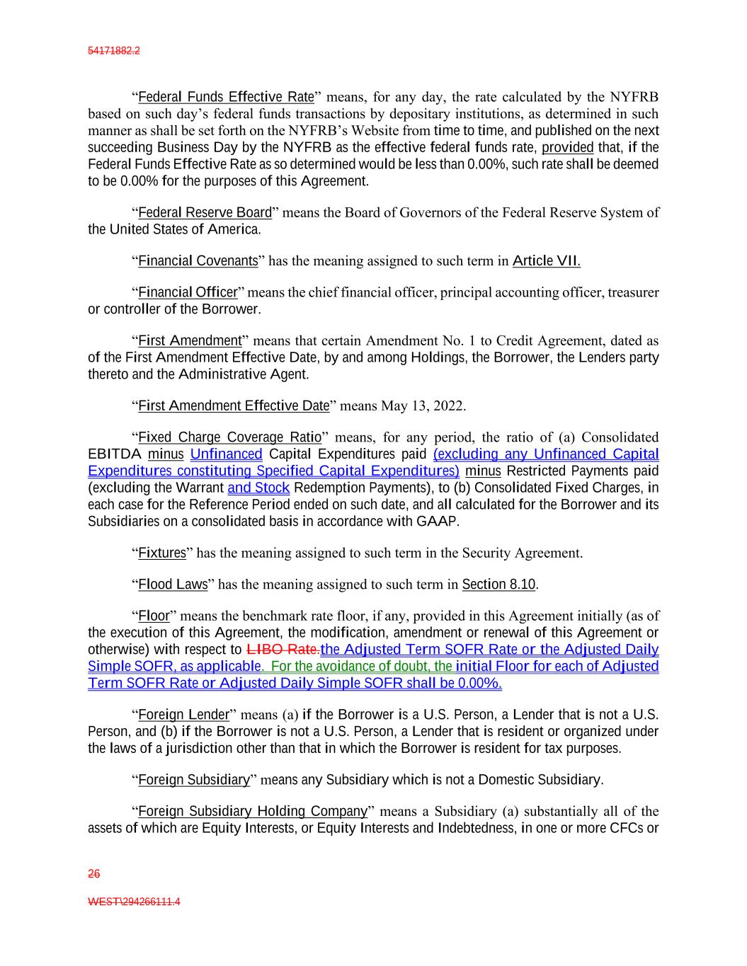 54171882.2 26 WEST\294266111.4 “Federal Funds Effective Rate” means, for any day, the rate calculated by the NYFRB based on such day’s federal funds transactions by depositary institutions, as determined in such manner as shall be set forth on the NYFRB’s Website from time to time, and published on the next succeeding Business Day by the NYFRB as the effective federal funds rate, provided that, if the Federal Funds Effective Rate as so determined would be less than 0.00%, such rate shall be deemed to be 0.00% for the purposes of this Agreement. “Federal Reserve Board” means the Board of Governors of the Federal Reserve System of the United States of America. “Financial Covenants” has the meaning assigned to such term in Article VII. “Financial Officer” means the chief financial officer, principal accounting officer, treasurer or controller of the Borrower. “First Amendment” means that certain Amendment No. 1 to Credit Agreement, dated as of the First Amendment Effective Date, by and among Holdings, the Borrower, the Lenders party thereto and the Administrative Agent. “First Amendment Effective Date” means May 13, 2022. “Fixed Charge Coverage Ratio” means, for any period, the ratio of (a) Consolidated EBITDA minus Unfinanced Capital Expenditures paid (excluding any Unfinanced Capital Expenditures constituting Specified Capital Expenditures) minus Restricted Payments paid (excluding the Warrant and Stock Redemption Payments), to (b) Consolidated Fixed Charges, in each case for the Reference Period ended on such date, and all calculated for the Borrower and its Subsidiaries on a consolidated basis in accordance with GAAP. “Fixtures” has the meaning assigned to such term in the Security Agreement. “Flood Laws” has the meaning assigned to such term in Section 8.10. “Floor” means the benchmark rate floor, if any, provided in this Agreement initially (as of the execution of this Agreement, the modification, amendment or renewal of this Agreement or otherwise) with respect to LIBO Rate.the Adjusted Term SOFR Rate or the Adjusted Daily Simple SOFR, as applicable. For the avoidance of doubt, the initial Floor for each of Adjusted Term SOFR Rate or Adjusted Daily Simple SOFR shall be 0.00%. “Foreign Lender” means (a) if the Borrower is a U.S. Person, a Lender that is not a U.S. Person, and (b) if the Borrower is not a U.S. Person, a Lender that is resident or organized under the laws of a jurisdiction other than that in which the Borrower is resident for tax purposes. “Foreign Subsidiary” means any Subsidiary which is not a Domestic Subsidiary. “Foreign Subsidiary Holding Company” means a Subsidiary (a) substantially all of the assets of which are Equity Interests, or Equity Interests and Indebtedness, in one or more CFCs or