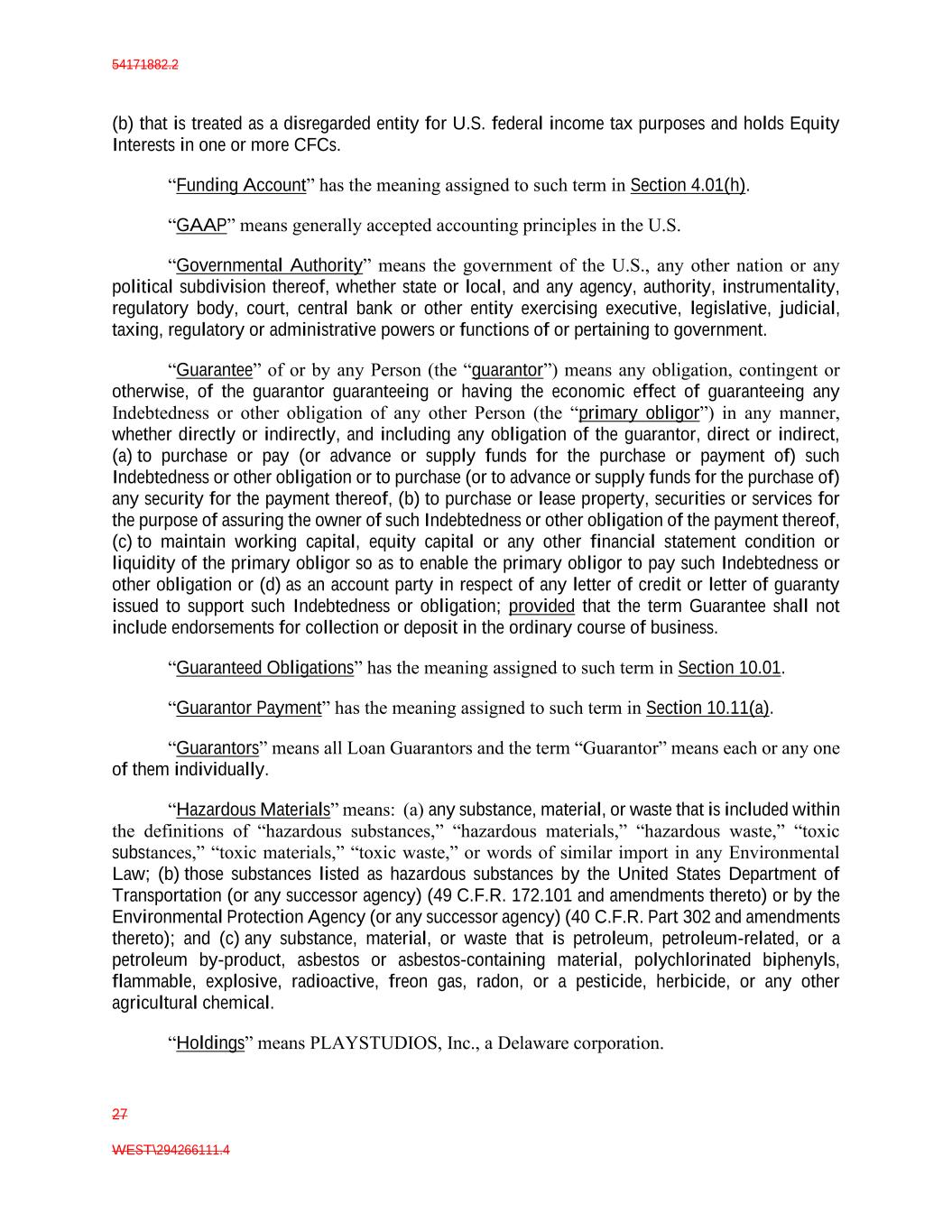 54171882.2 27 WEST\294266111.4 (b) that is treated as a disregarded entity for U.S. federal income tax purposes and holds Equity Interests in one or more CFCs. “Funding Account” has the meaning assigned to such term in Section 4.01(h). “GAAP” means generally accepted accounting principles in the U.S. “Governmental Authority” means the government of the U.S., any other nation or any political subdivision thereof, whether state or local, and any agency, authority, instrumentality, regulatory body, court, central bank or other entity exercising executive, legislative, judicial, taxing, regulatory or administrative powers or functions of or pertaining to government. “Guarantee” of or by any Person (the “guarantor”) means any obligation, contingent or otherwise, of the guarantor guaranteeing or having the economic effect of guaranteeing any Indebtedness or other obligation of any other Person (the “primary obligor”) in any manner, whether directly or indirectly, and including any obligation of the guarantor, direct or indirect, (a) to purchase or pay (or advance or supply funds for the purchase or payment of) such Indebtedness or other obligation or to purchase (or to advance or supply funds for the purchase of) any security for the payment thereof, (b) to purchase or lease property, securities or services for the purpose of assuring the owner of such Indebtedness or other obligation of the payment thereof, (c) to maintain working capital, equity capital or any other financial statement condition or liquidity of the primary obligor so as to enable the primary obligor to pay such Indebtedness or other obligation or (d) as an account party in respect of any letter of credit or letter of guaranty issued to support such Indebtedness or obligation; provided that the term Guarantee shall not include endorsements for collection or deposit in the ordinary course of business. “Guaranteed Obligations” has the meaning assigned to such term in Section 10.01. “Guarantor Payment” has the meaning assigned to such term in Section 10.11(a). “Guarantors” means all Loan Guarantors and the term “Guarantor” means each or any one of them individually. “Hazardous Materials” means: (a) any substance, material, or waste that is included within the definitions of “hazardous substances,” “hazardous materials,” “hazardous waste,” “toxic substances,” “toxic materials,” “toxic waste,” or words of similar import in any Environmental Law; (b) those substances listed as hazardous substances by the United States Department of Transportation (or any successor agency) (49 C.F.R. 172.101 and amendments thereto) or by the Environmental Protection Agency (or any successor agency) (40 C.F.R. Part 302 and amendments thereto); and (c) any substance, material, or waste that is petroleum, petroleum-related, or a petroleum by-product, asbestos or asbestos-containing material, polychlorinated biphenyls, flammable, explosive, radioactive, freon gas, radon, or a pesticide, herbicide, or any other agricultural chemical. “Holdings” means PLAYSTUDIOS, Inc., a Delaware corporation.